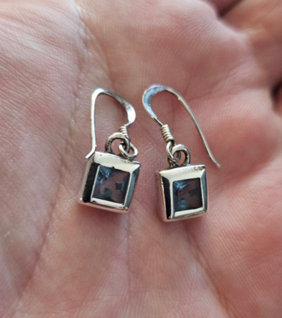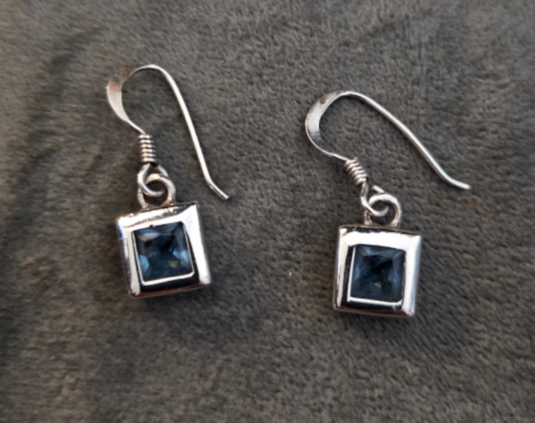 Sterling silver dangle earrings with square blue topaz stones. Stamped 925