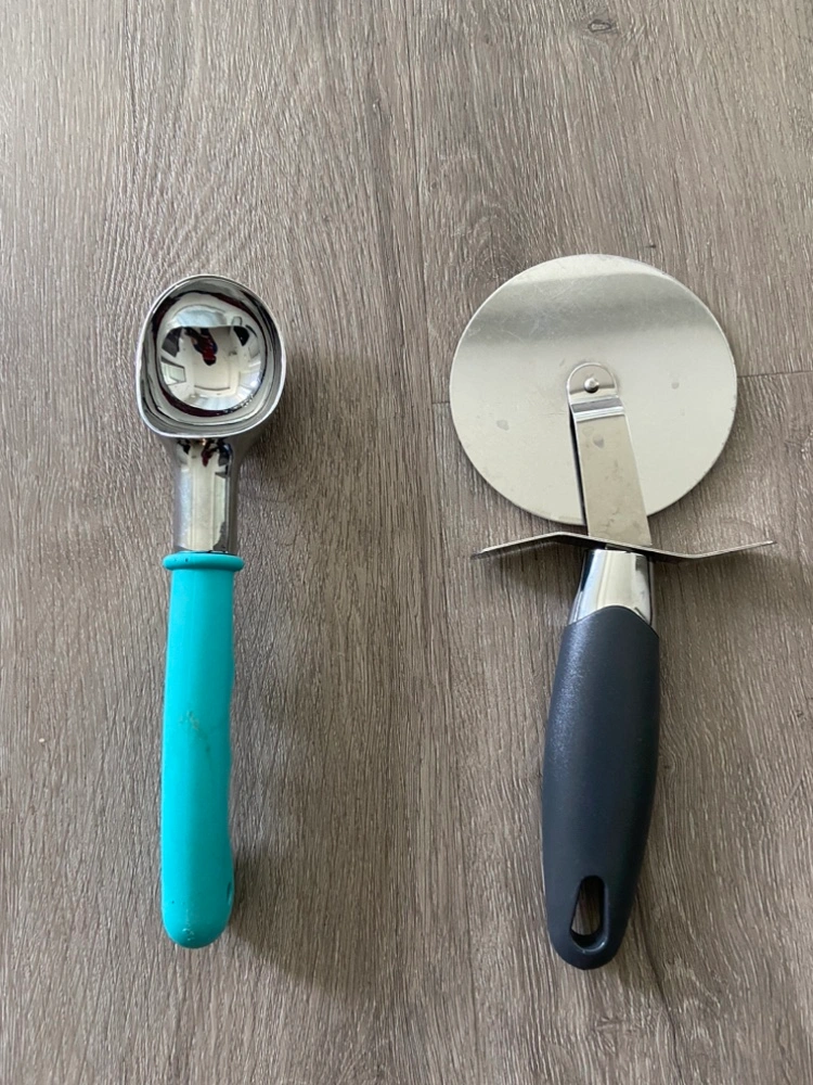 A blue handled ice cream scoop and a pizza cutter with a black handle. Both are in good condition and ready to use.