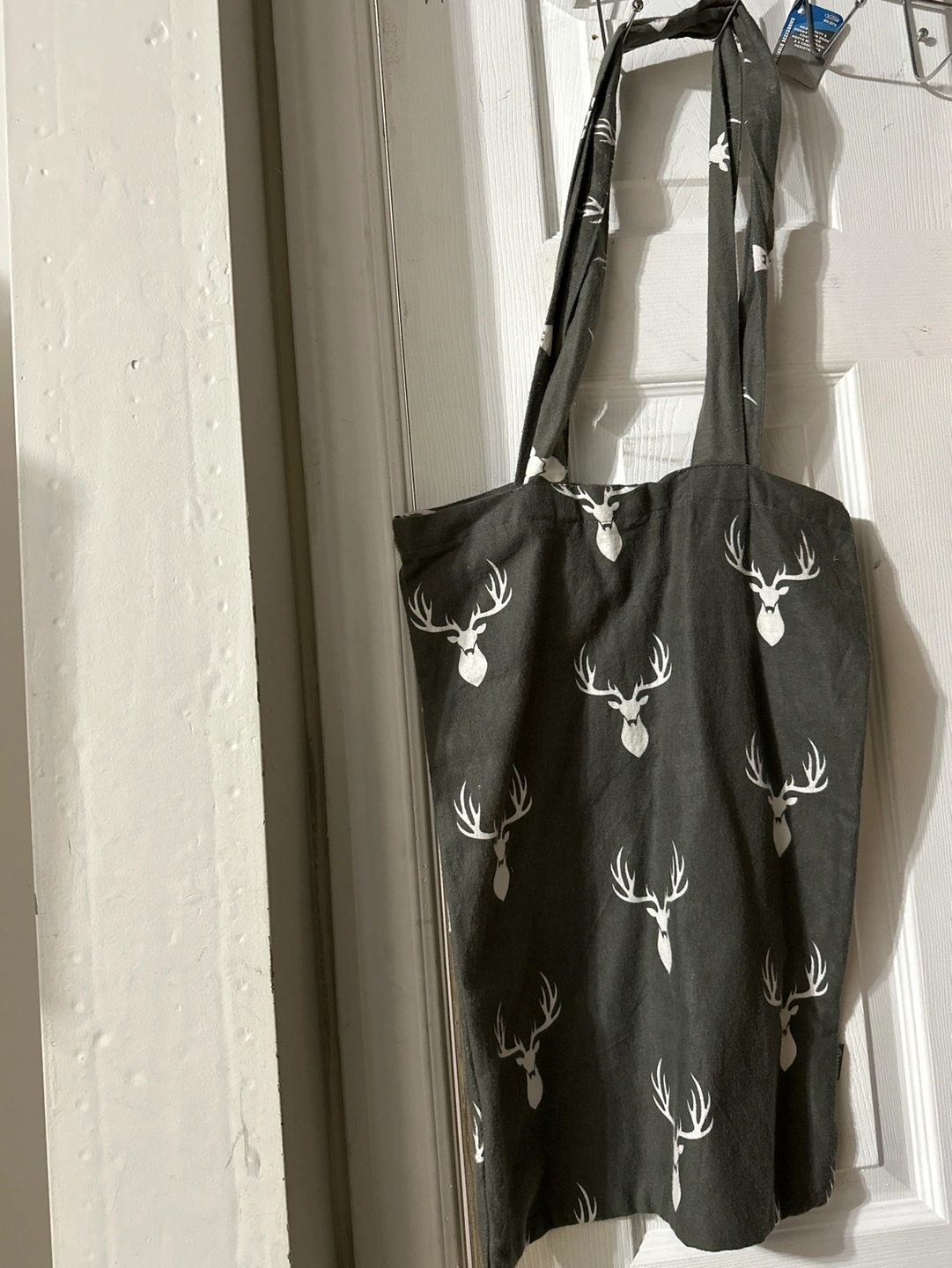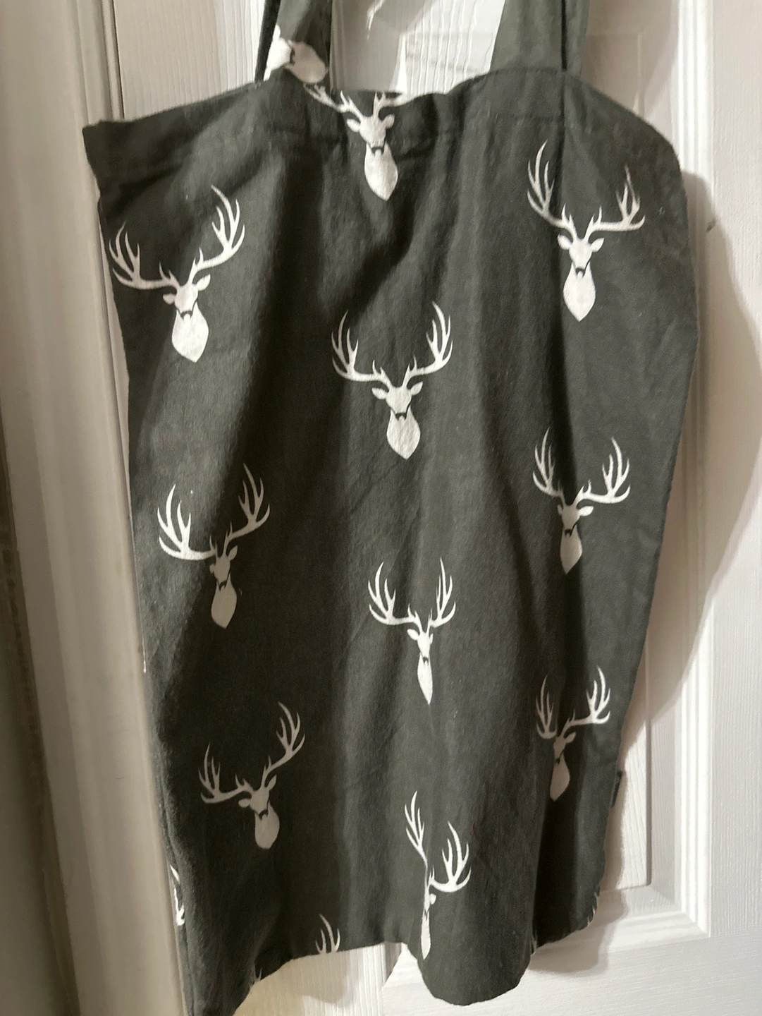 A grey tote bag with a white deer pattern. It has two long handles. Very spacious. No stain. Soft material.