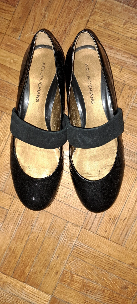 These black flats are by Arturo Chiang and feature a black elastic band across the top of the foot. They are in good condition with some wear on the soles. size 7.5 but never been worn bec my feet are wide...heels are a low 1 in. good for spring or fall or office wear (posted only now and trying to recoup some amount) purchased from Poshmark last spring can do try out before purchase cash only pick up only