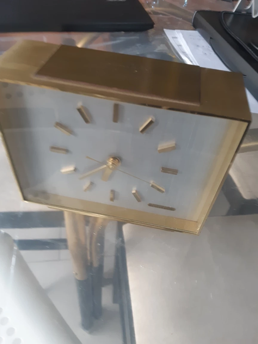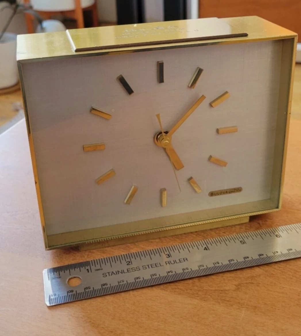 Bulova Brass Case Table Clock - Quartz Movement Made In France Nice vintage Bulova Quartz table clock. The quartz movement is made in France. Case is about 6 1/2" wide by 5 1/2" tall. Keeps time perfectly. Uses a single C cell battery. Material: Brass Color: Golden Style: VintageGold toned clock in good condition. No battery included.