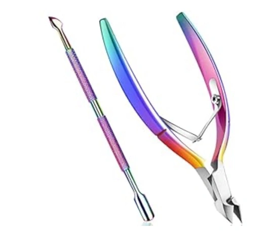 Brand new never used! A set of two nail tools. The clipper is a rainbow colour, and the pusher is stainless steel with a rainbow colour finish.