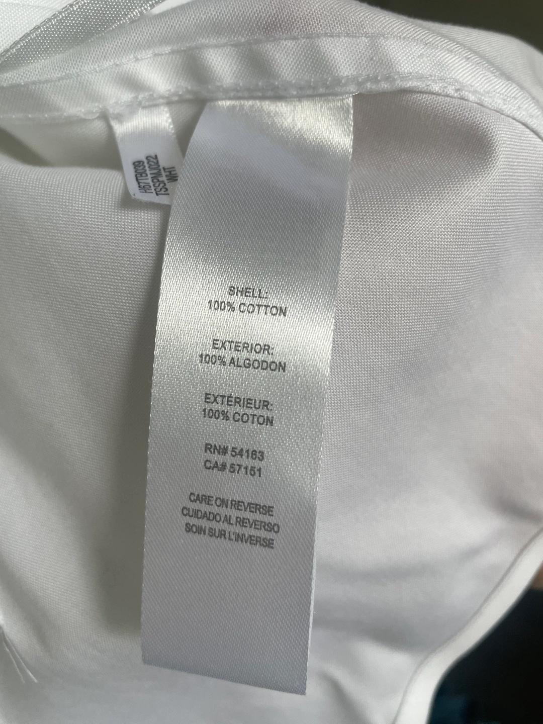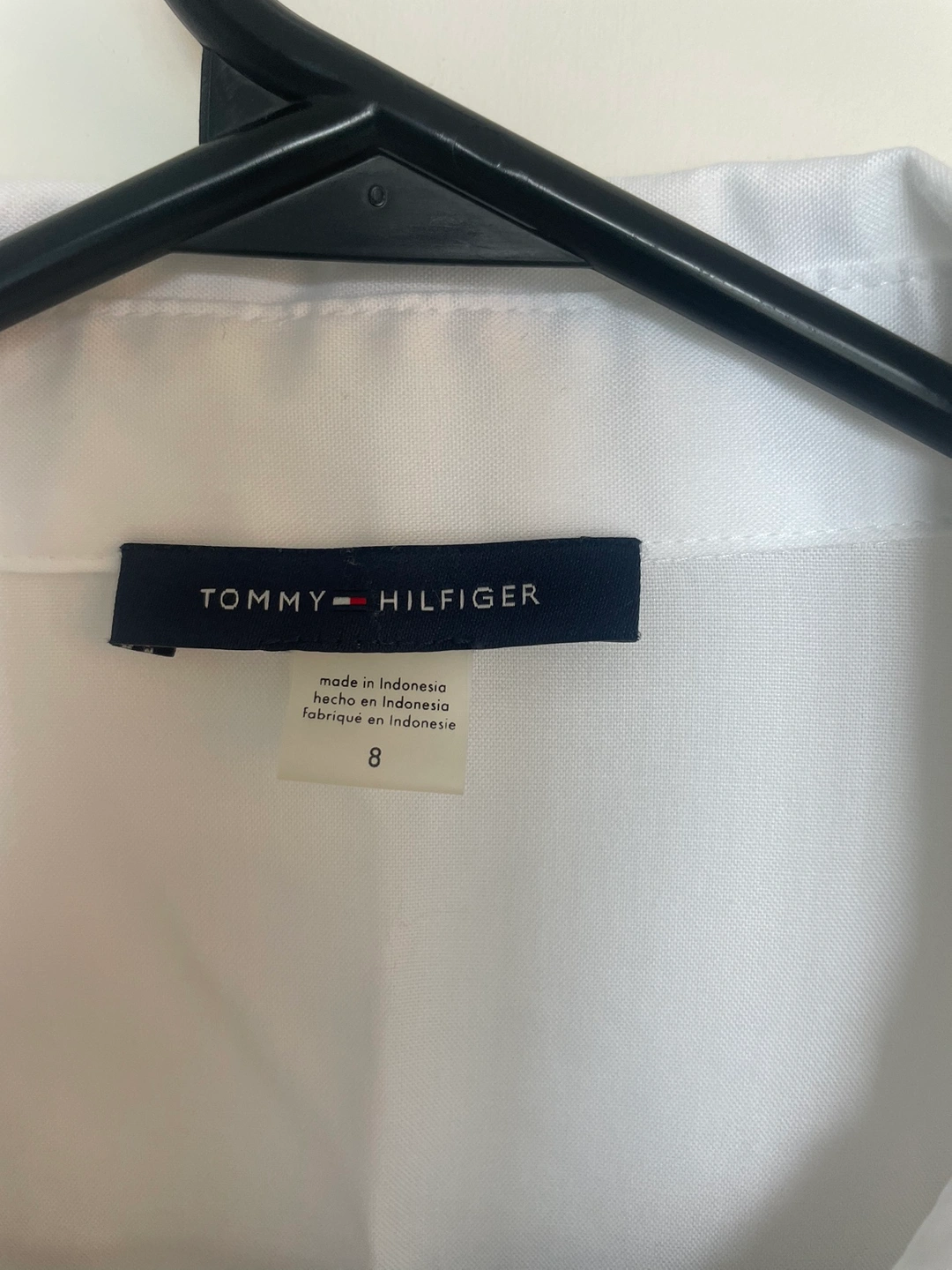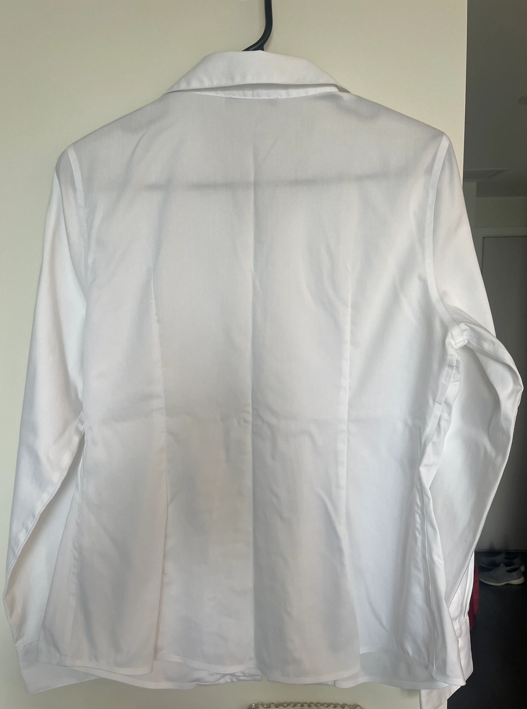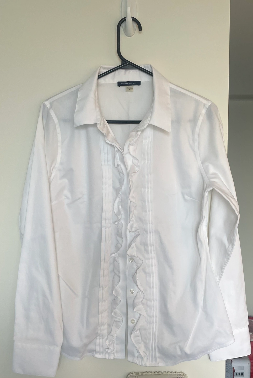 White long-sleeve blouse with ruffle detail. Size 8. Made in Indonesia. 100% cotton Only worn a couple of times. Unfortunately, it doesn't fit me anymore. Perfect to add to your work attire wardrobe or just a casual look with some jeans! Cash & Pick up only. (King & Blue Jays Way)
