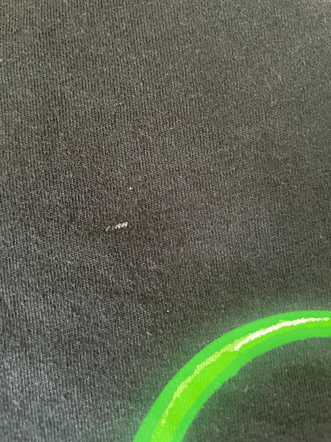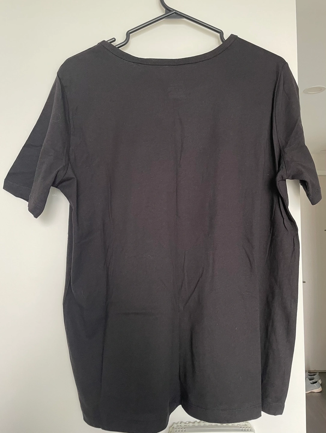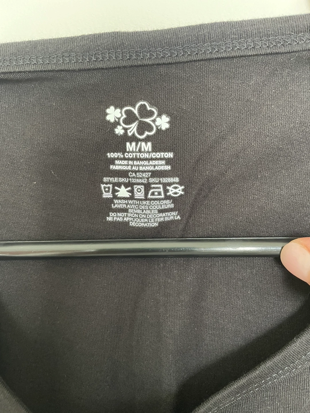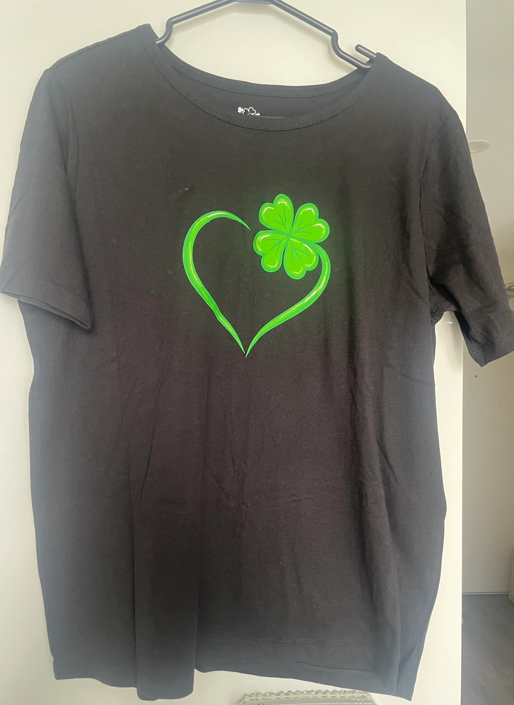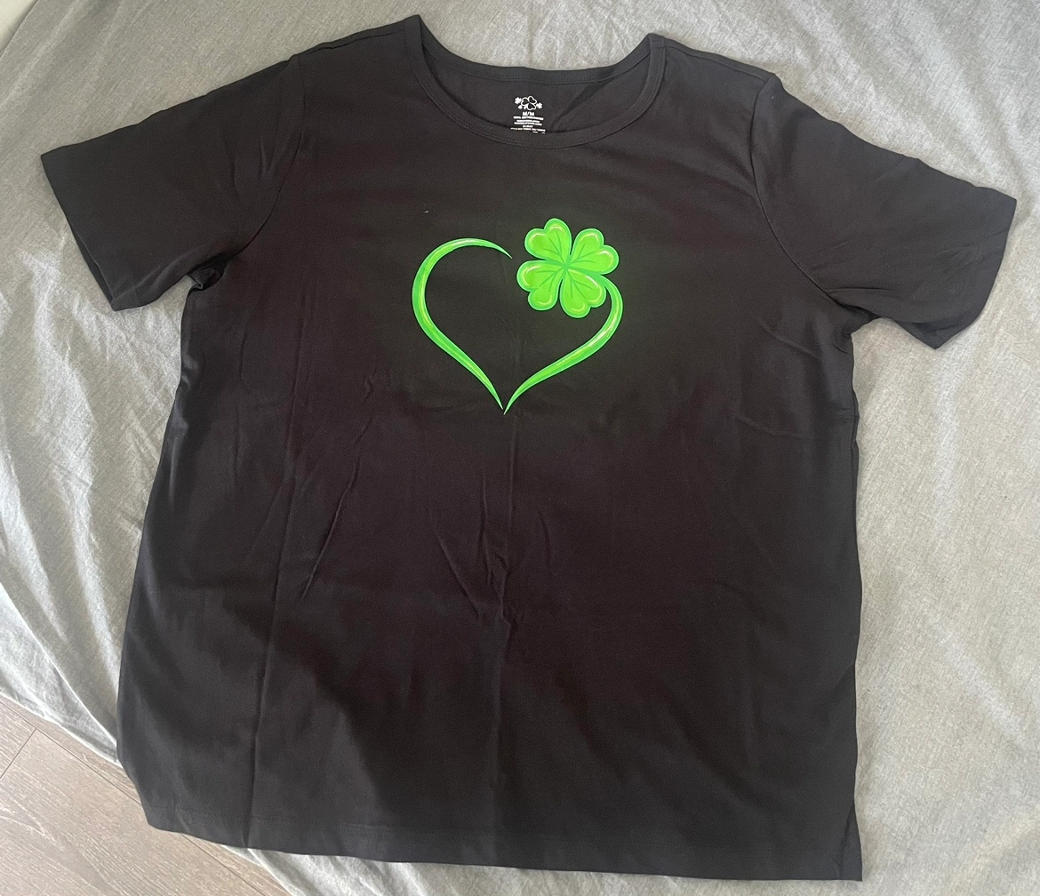 A black 100% cotton t-shirt with a green clover and heart graphic on the front. The shirt is a standard fit with short sleeves. There is a slight white mark. It is not a stain. It's part of the fabric. (see last photo) Price is reflective of that. Never worn.