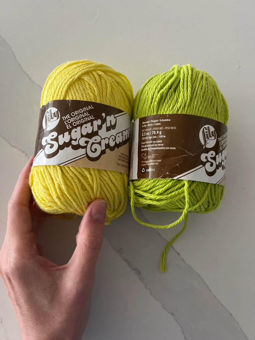 Two skeins of Sugar'n Cream yarn in yellow and green colours. Each skein contains 2.5 oz (70.9 g) of yarn and 120 yards (109 m). Free pattern is included on each label.