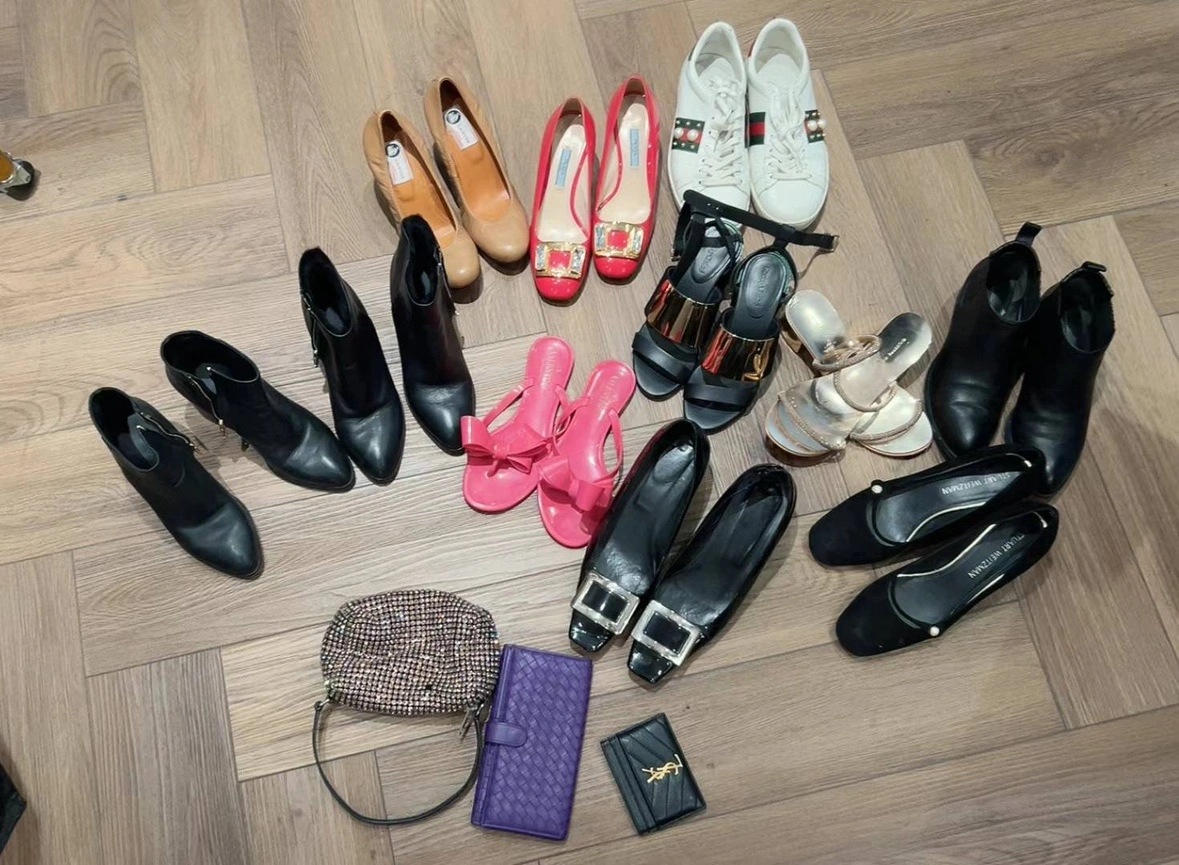 A bundle of shoes, purses and a card holder. All authentic or your money back All in good condition