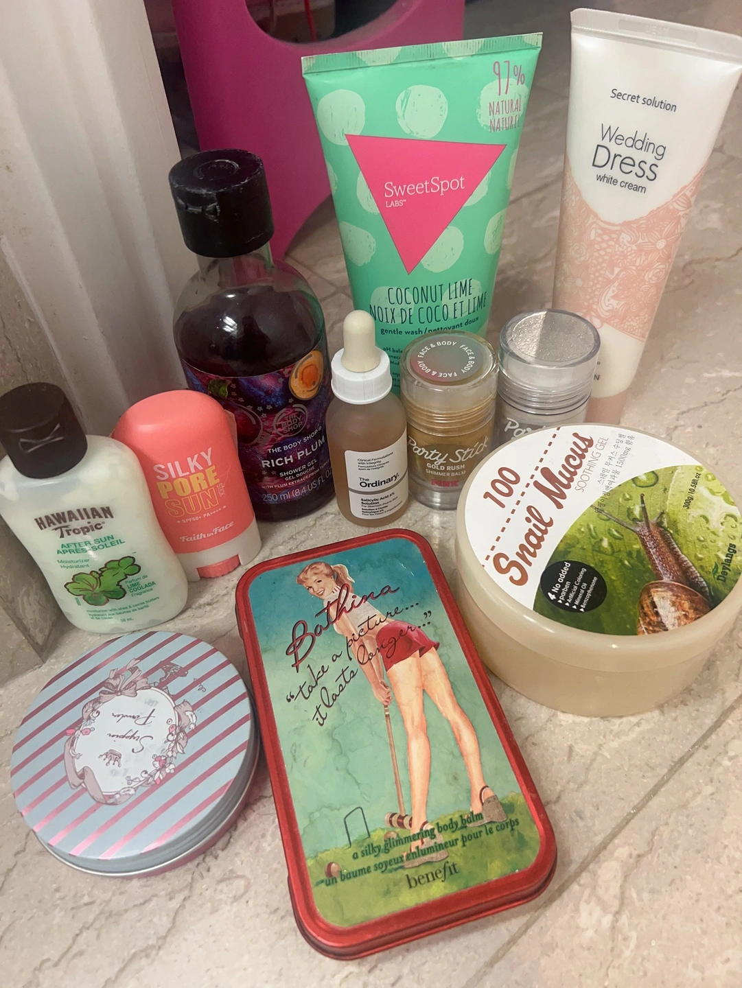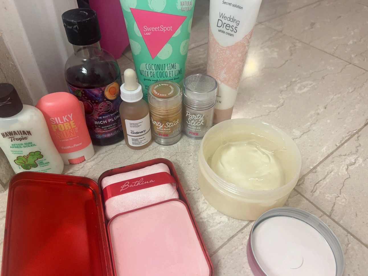A selection of different body lotions, soaps, and beauty products. Please note some of them have been expired. Most of them have more than half left. All of them have been opened. Pick up today preferred. First come first serve.