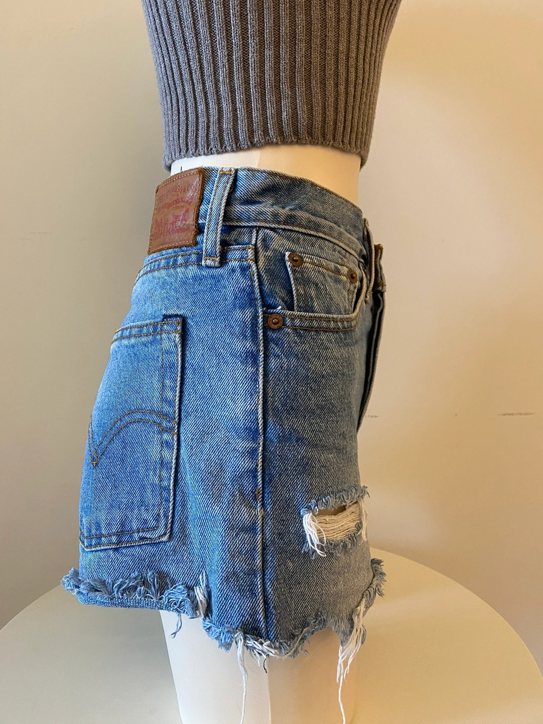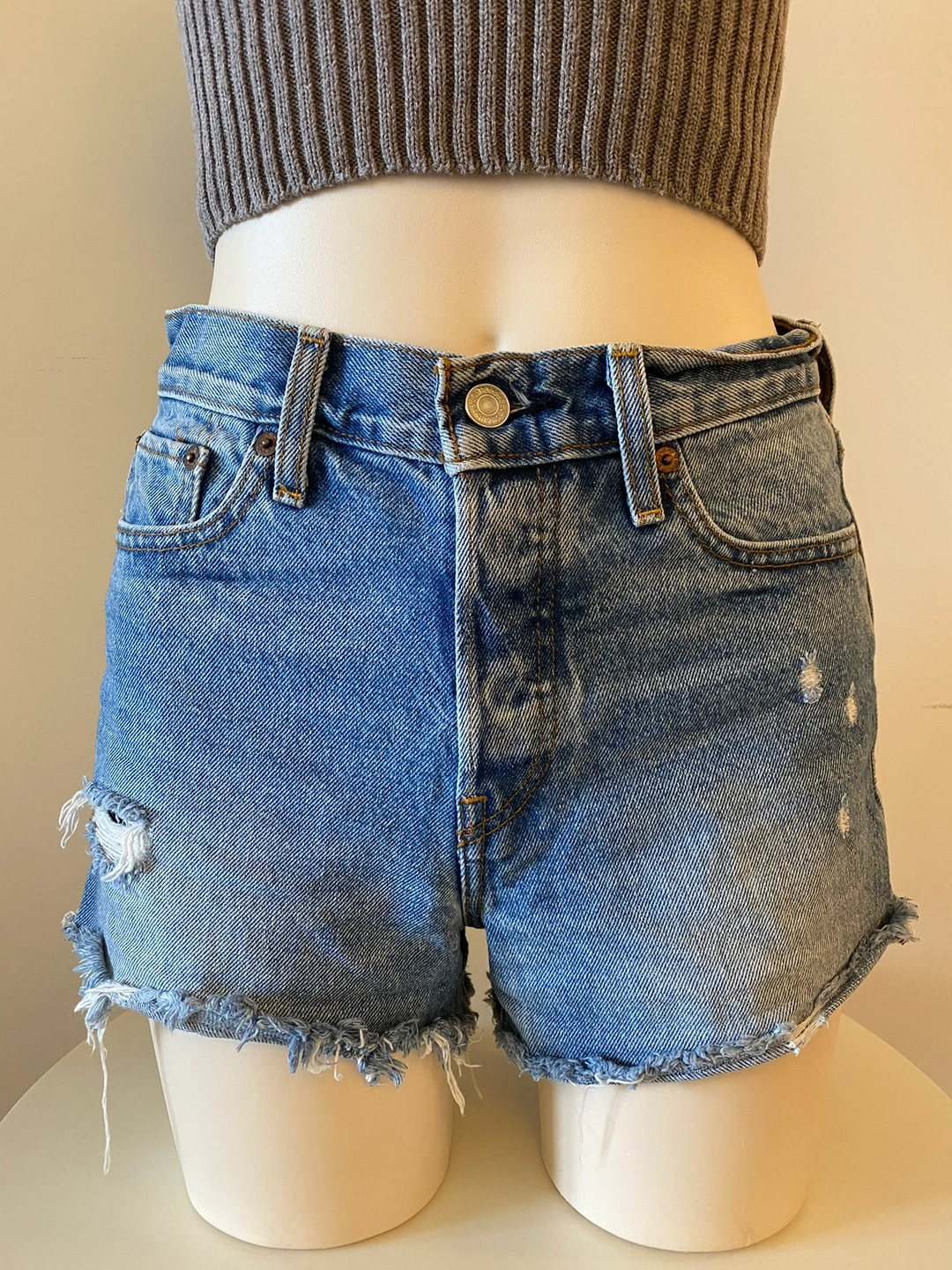 Super cute high-waisted washed denim shorts with a frayed hem and distressing Size 26” waist Cash only. Msg to schedule pick up:)