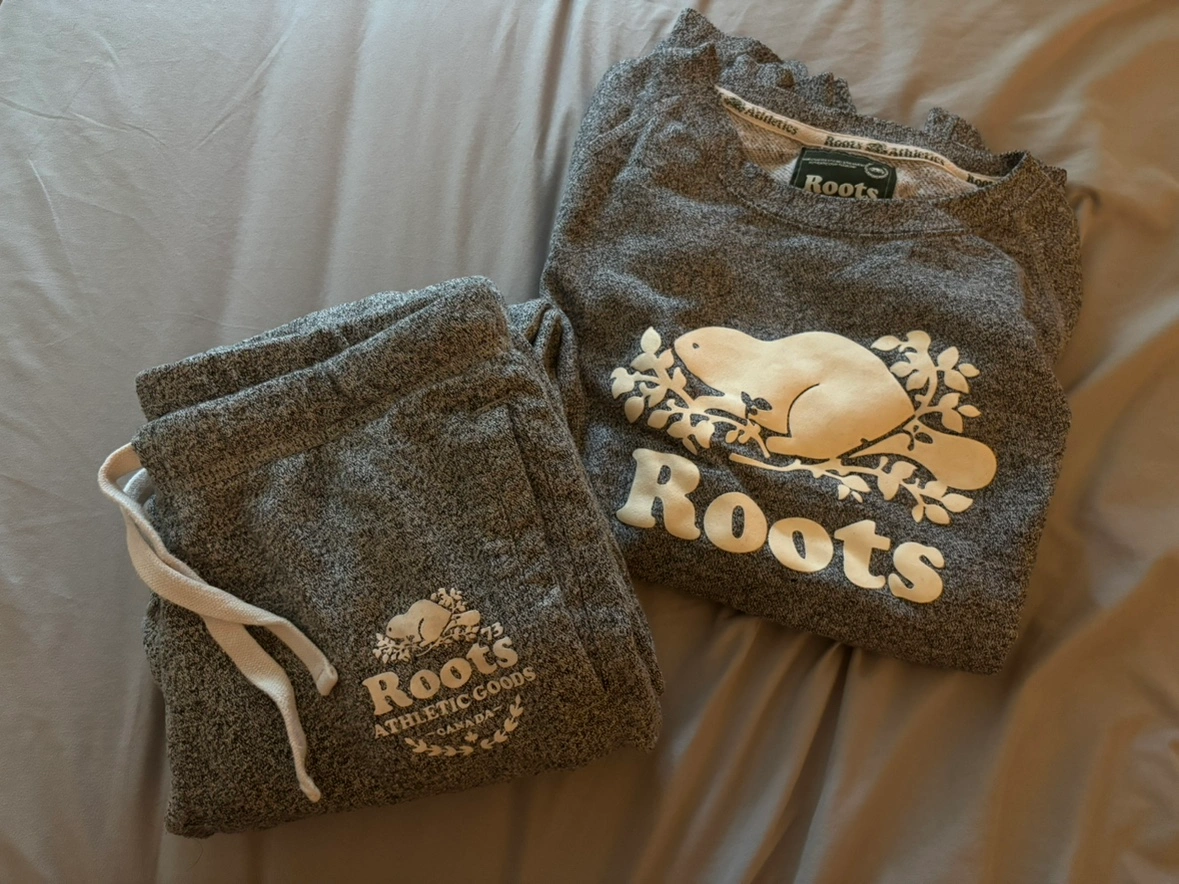 Salt & Pepper colored Roots sweatshirt and sweatpants set as shown in the picture. NO stains or rips. In a like new condition. Sweatshirt is size M Sweatpants is size XS $90 for BOTH. Currently retails at $82 for just the sweatshirt and $84 just for the sweatpants.