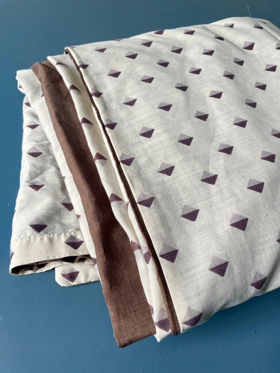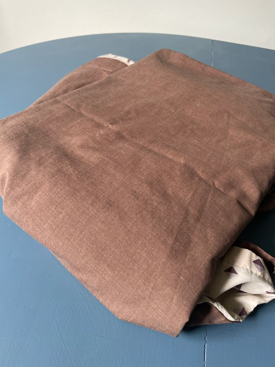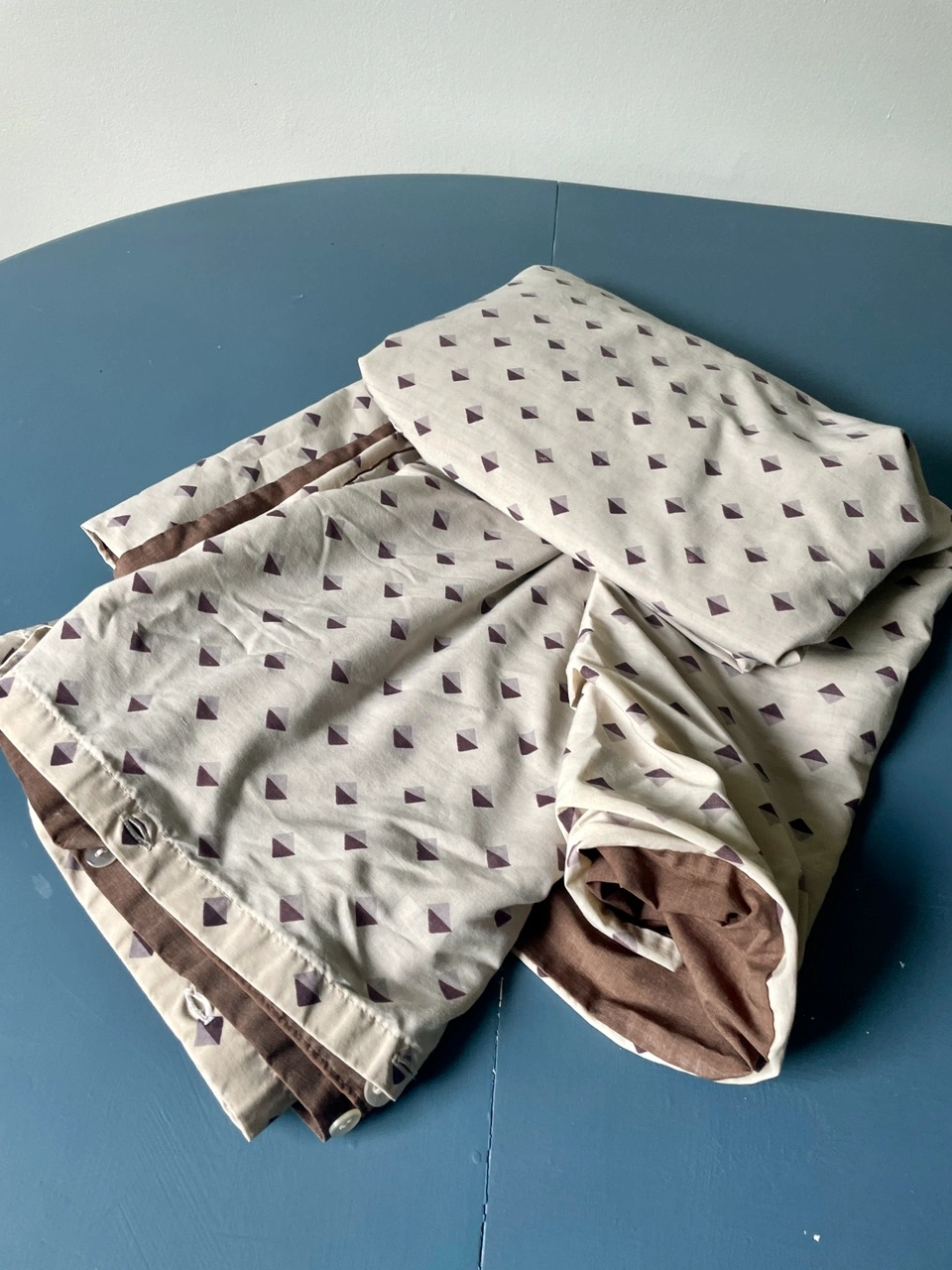 Beige with brown geometric pattern, brown reverse side. Freshly laundered and ready to sleep in. I’ll be selling this along with other items from my profile this Saturday sept 21 at south arm community centre’s big annual swap meet in Richmond. 10-2. Free parking and admission! You don’t want to miss it! Bring cash & a shopping bag for your goodies!