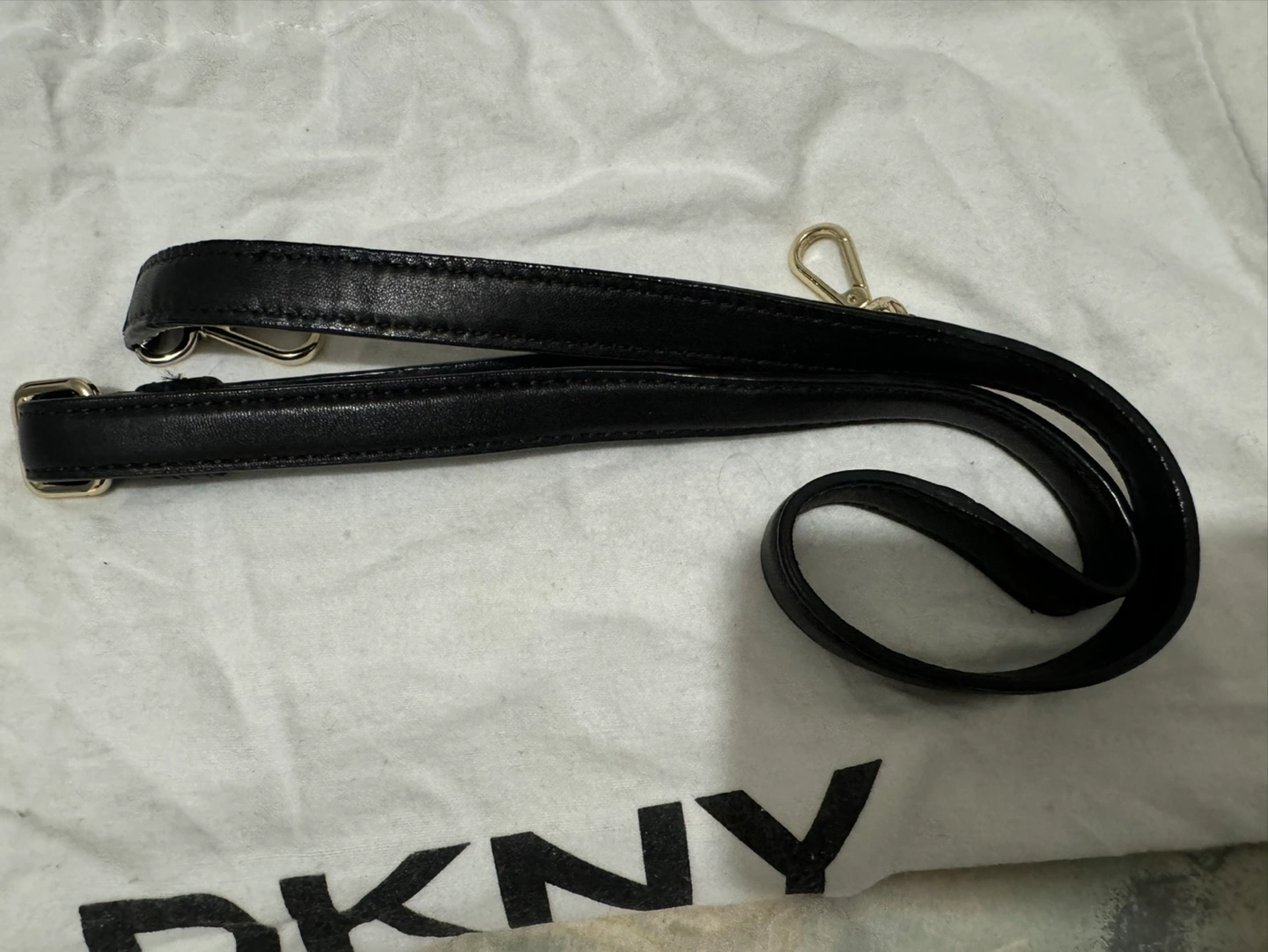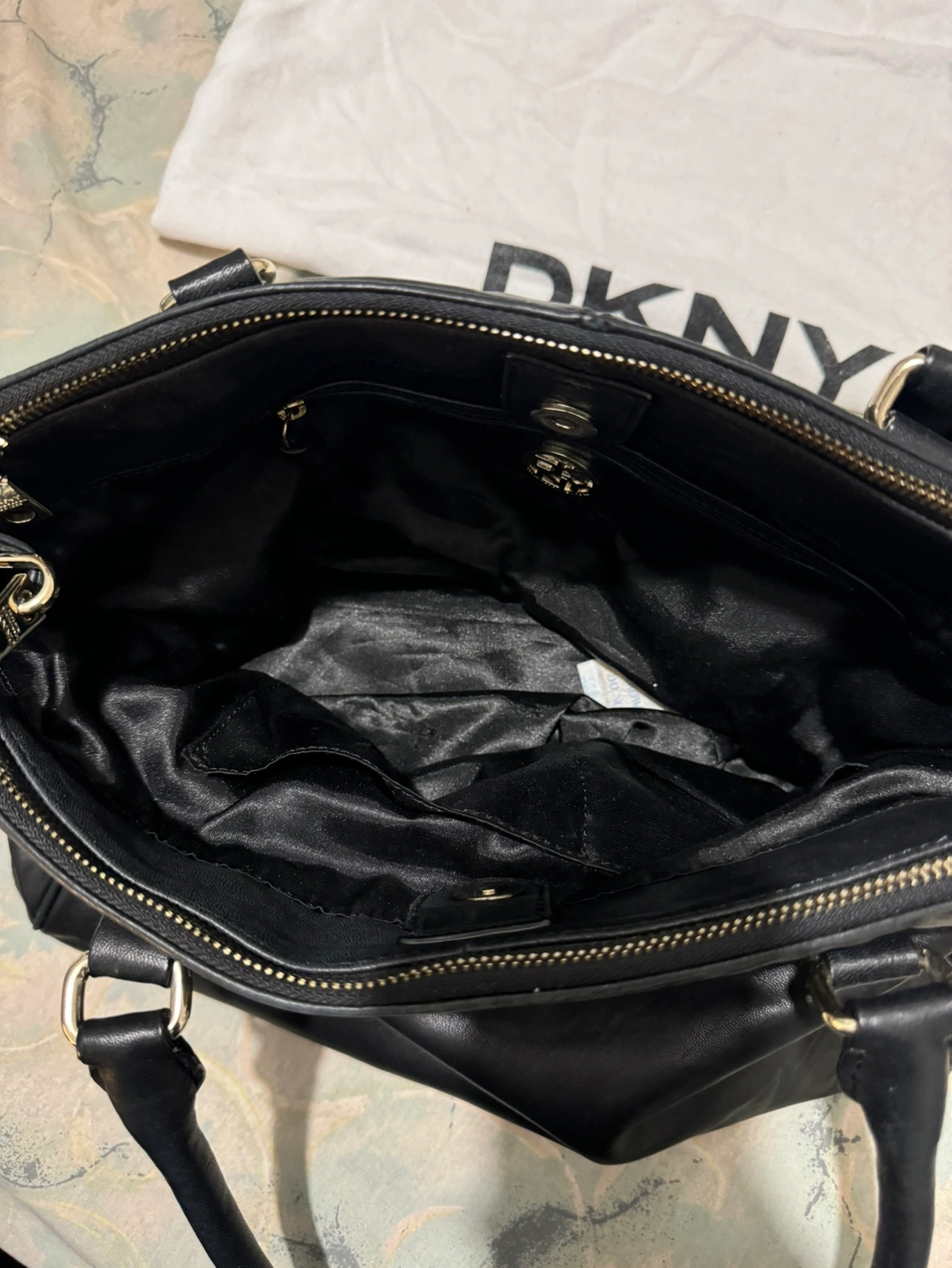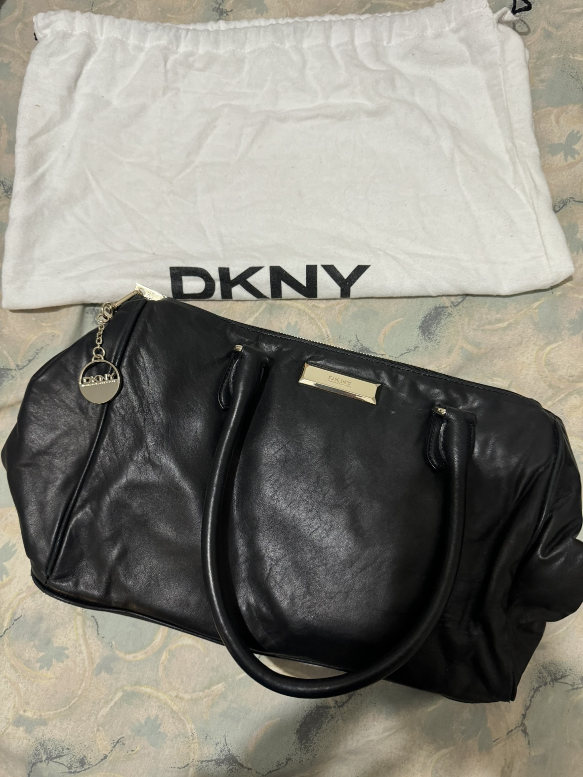 Black leather handbag by Donna Karan New York (DKNY) with gold hardware. Comes with dust bag. Comes with removable strap to carry as messenger bag. Removable key chain. Two zipped pouches inside (one on the front side and one on the back). Small pouch on the side along with a zipped pouch on the back side. Has a retractable lock. Spacious bag. Can carry a lot. Used to carry binders for school purposes. Straps are thicker. Can carry as a shoulder bag, messenger bag, or as a handbag. Condition: Like new, bag is in great condition. Material: Soft genuine black leather. Selling for $20. Comes with a DKNY dust bag for storage. Smoke-free, Pest-free, and Pet free home. Cash please. Stockyards (Keele/St. Clair) Area or can meet with you at closer location.