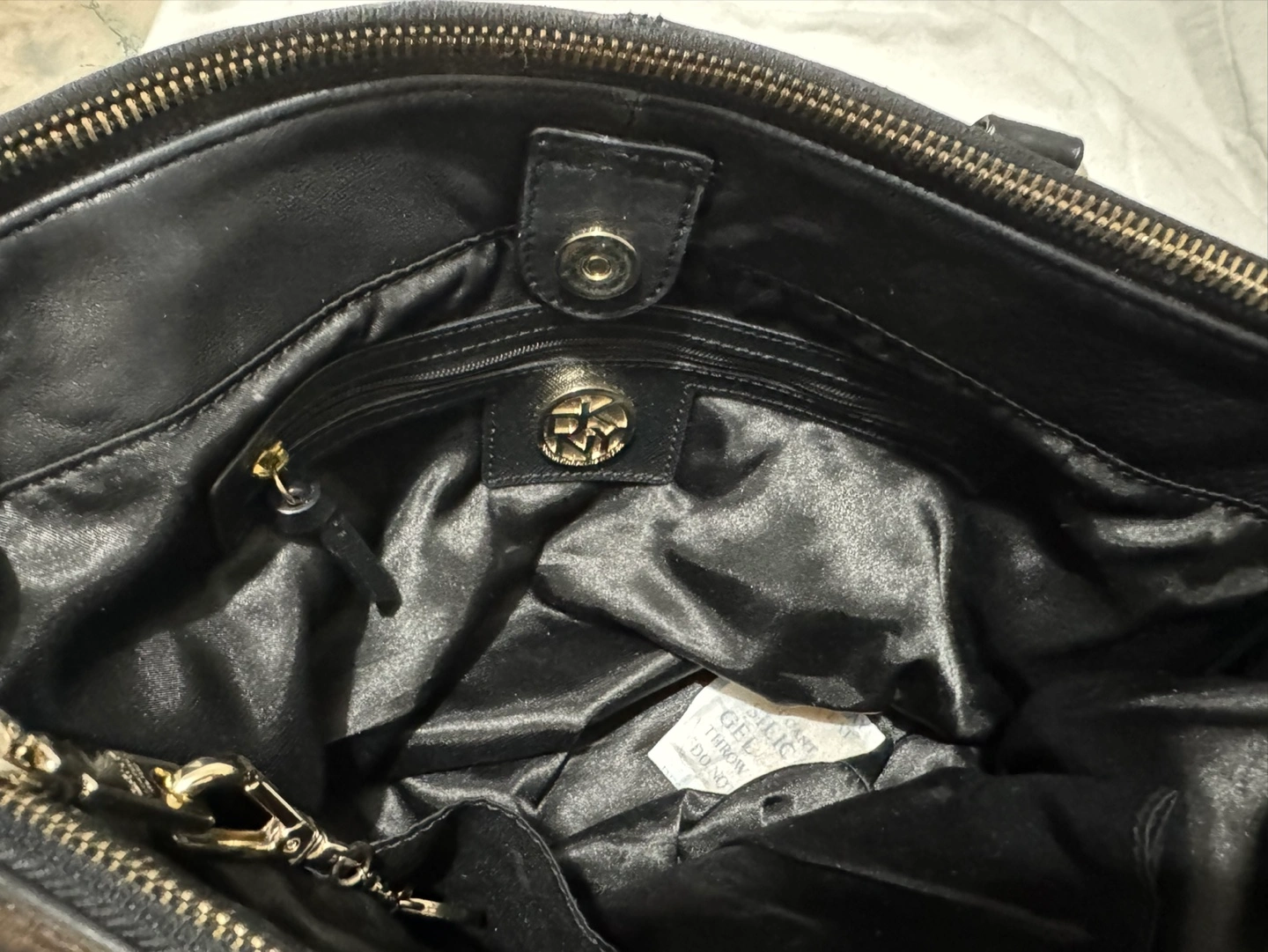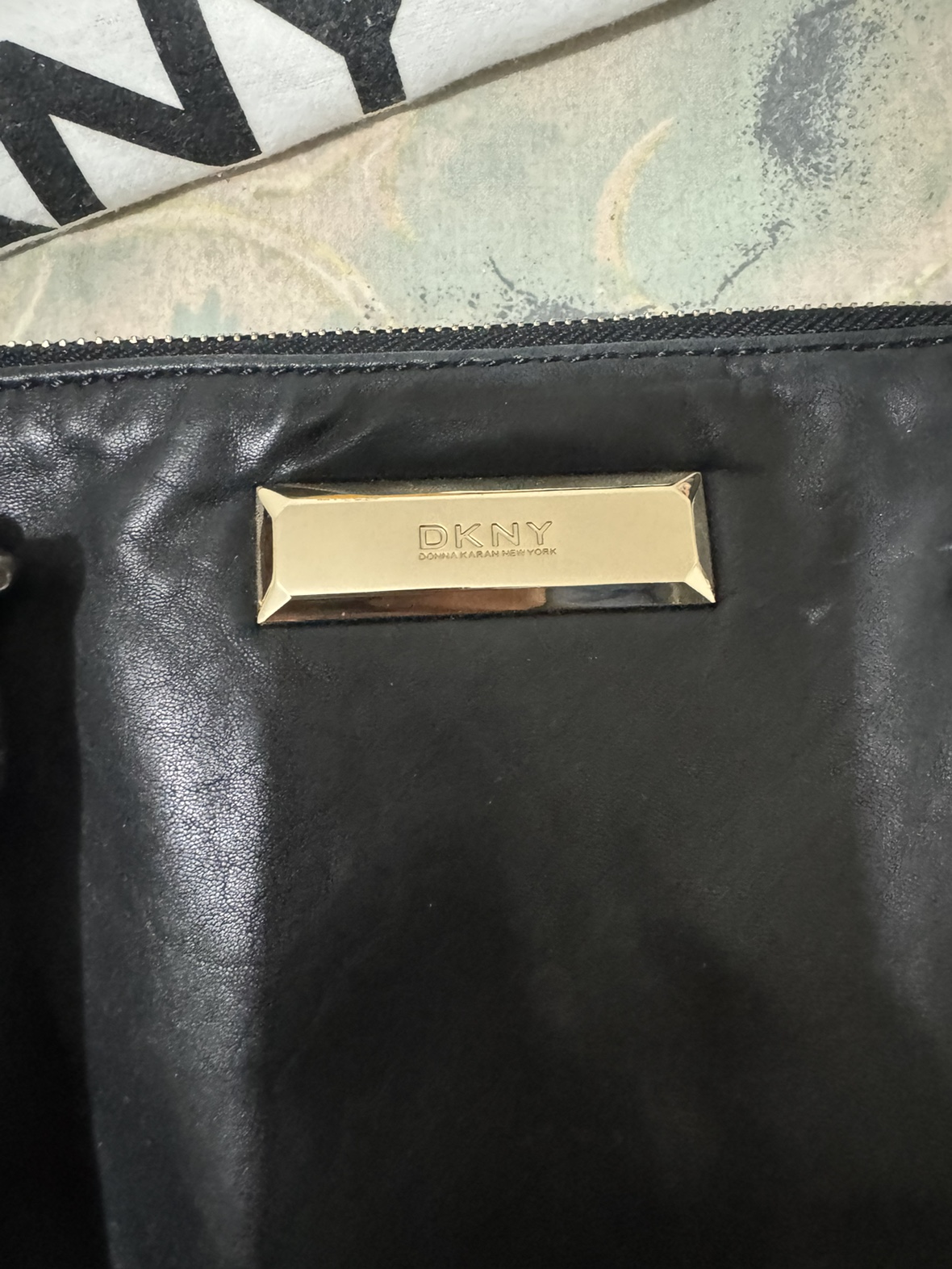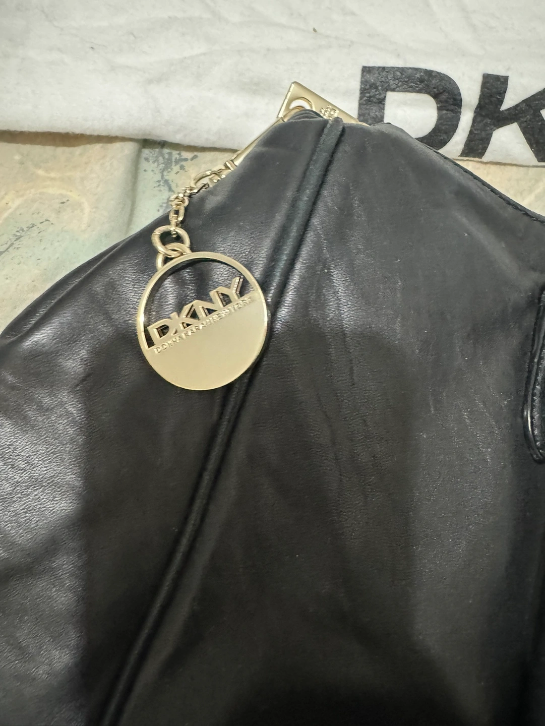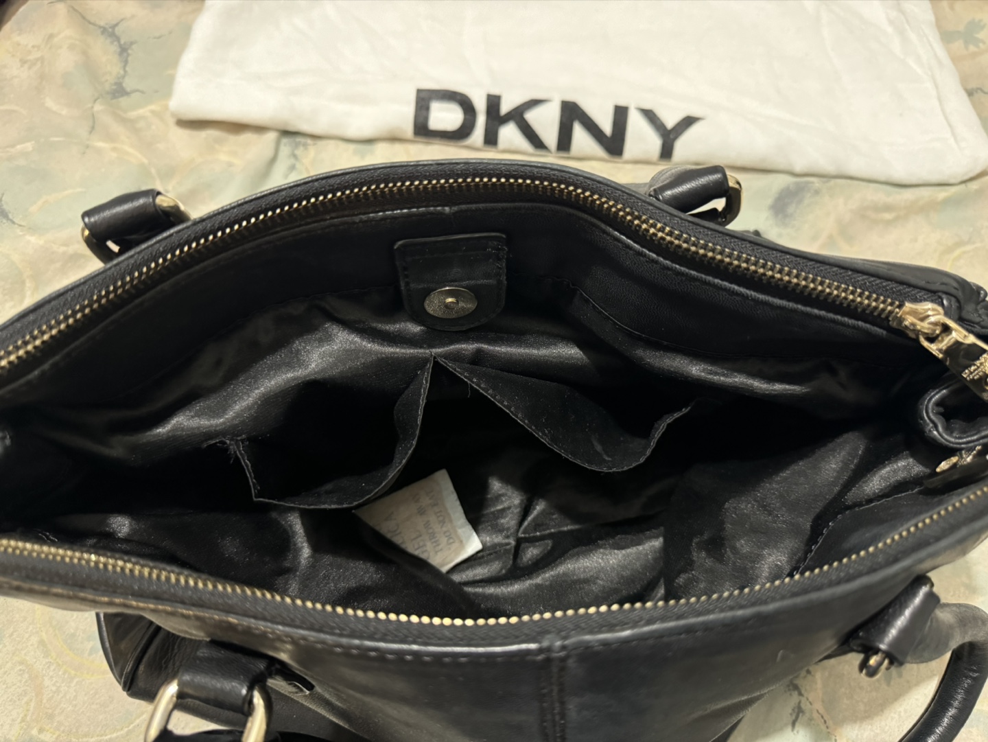 Black leather handbag by Donna Karan New York (DKNY) with gold hardware. Comes with dust bag. Comes with removable strap to carry as messenger bag. Removable key chain. Two zipped pouches inside (one on the front side and one on the back). Small pouch on the side along with a zipped pouch on the back side. Has a retractable lock. Spacious bag. Can carry a lot. Used to carry binders for school purposes. Straps are thicker. Can carry as a shoulder bag, messenger bag, or as a handbag. Condition: Like new, bag is in great condition. Material: Soft genuine black leather. Selling for $20. Comes with a DKNY dust bag for storage. Smoke-free, Pest-free, and Pet free home. Cash please. Stockyards (Keele/St. Clair) Area or can meet with you at closer location.