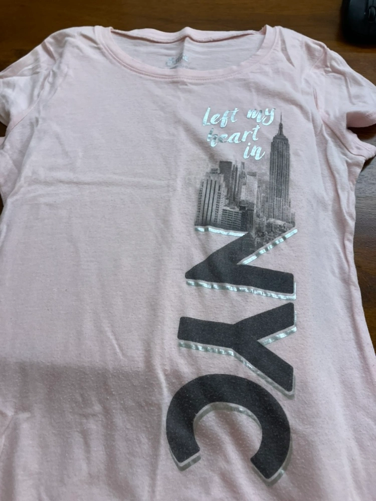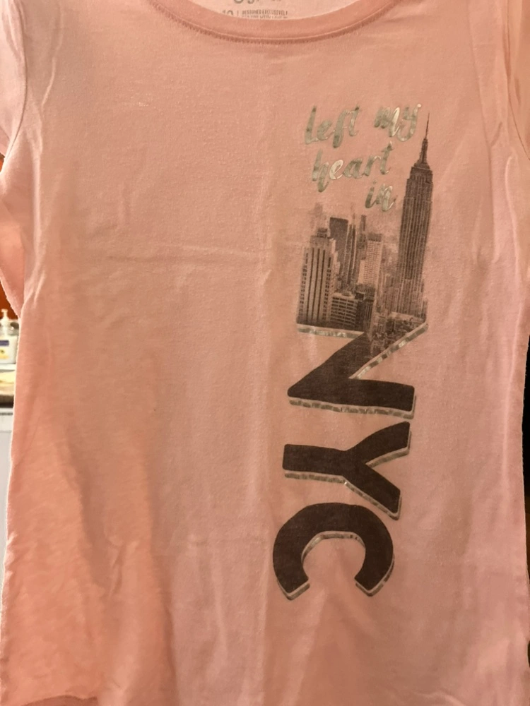 A pink t-shirt featuring a New York City skyline and the words "left my heart in NYC" on the front.