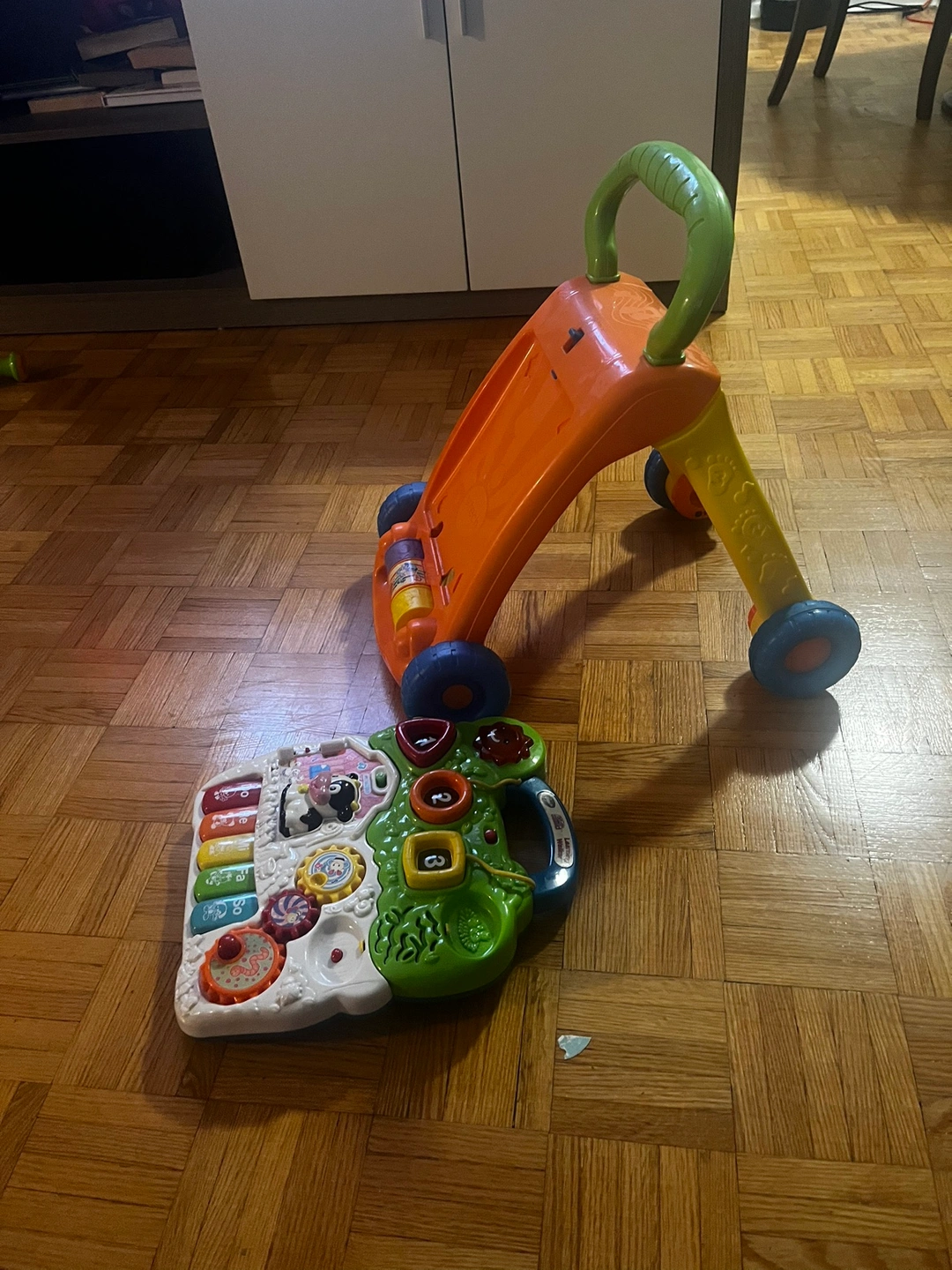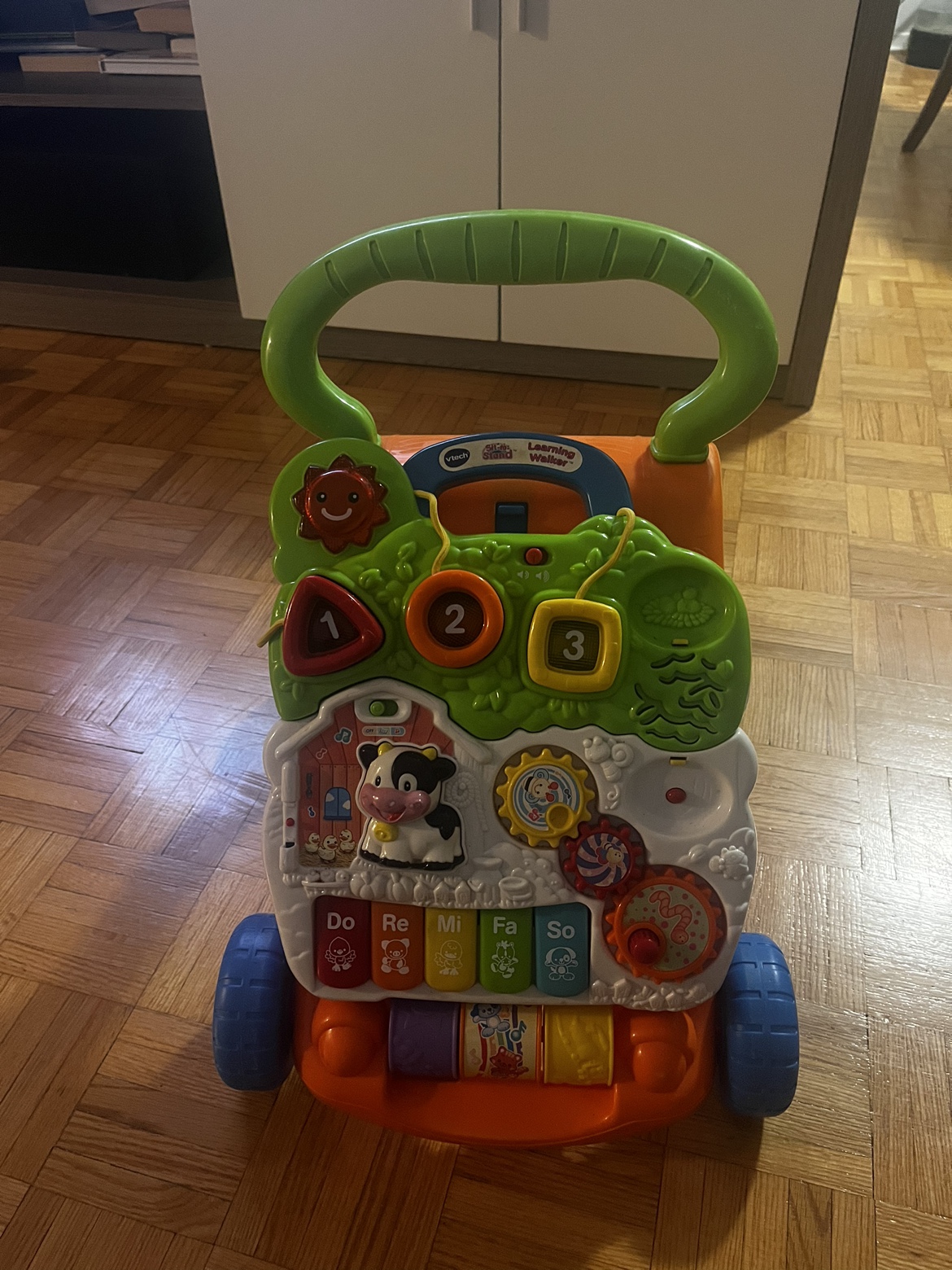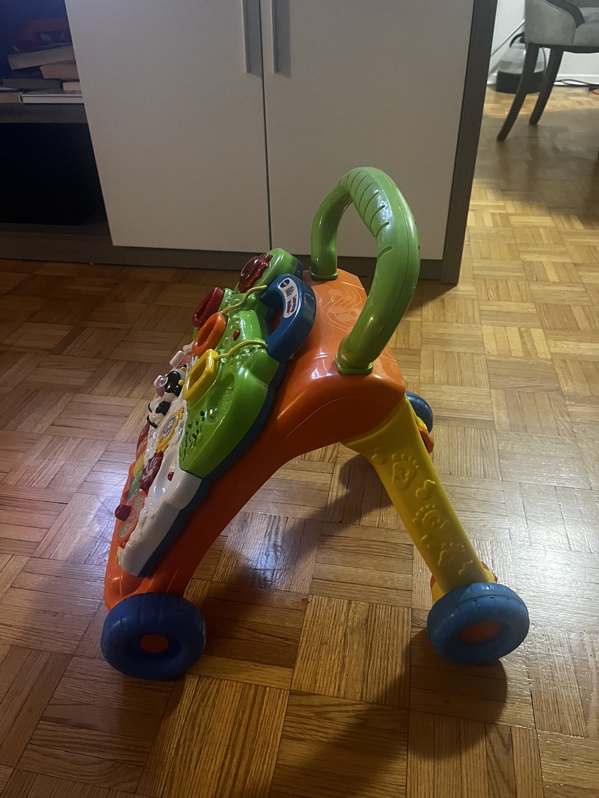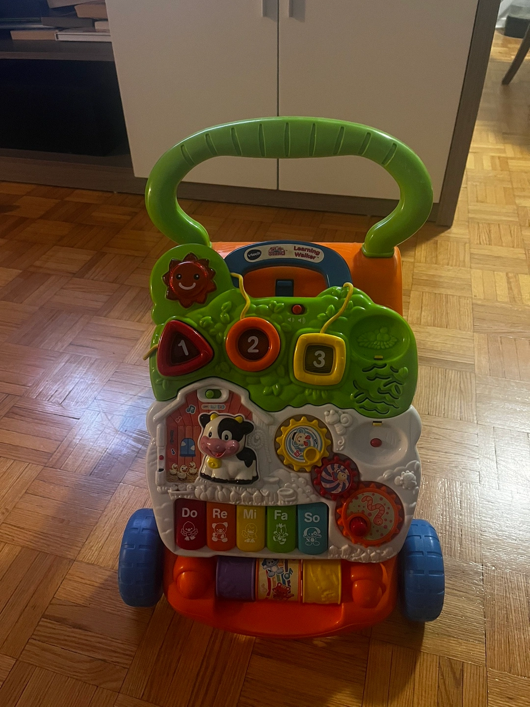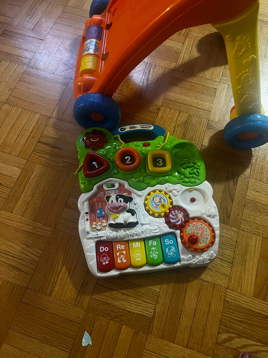 This is a VTech Sit-to-Stand Learning Walker. The toy features a variety of activities that help your child learn and grow. It includes a removable play panel that can be used on its own. This walker is in good condition and has been well-loved.