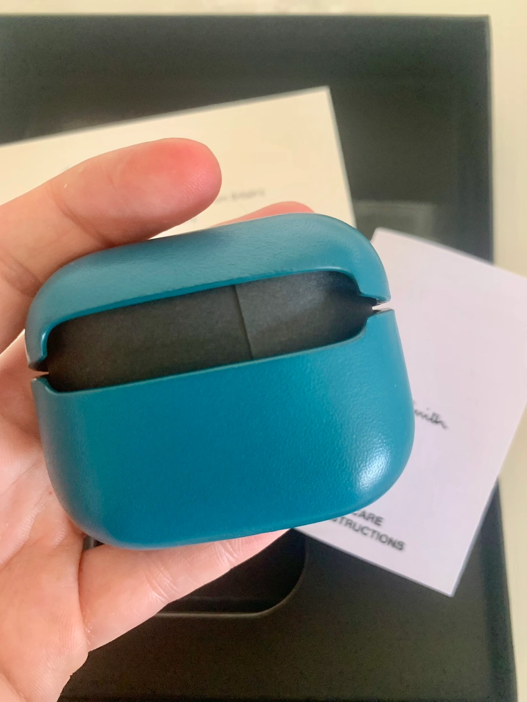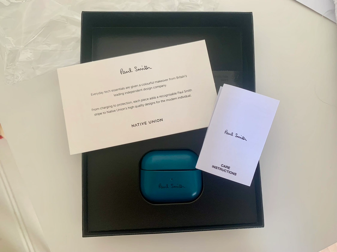 Brand new in package teal blue leather case for AirPods by Paul Smith. Includes gift box and care instructions. $50 Cash or etransfer Pick up in the West End on Barclay Street Crafted with genuine leather & finished with Paul Smith's logo. Handcrafted with care to be completely unique. Sleek & thin, yet reliably protective. Hassle-free access to AirPods Pro, charging port & controls. Compatible with Qi wireless charging & MagSafe when the charger is lying flat.