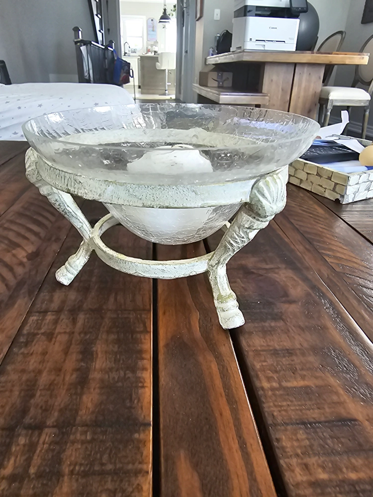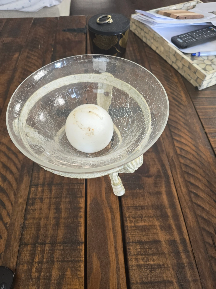 A decorative glass candle holder with a white metal base. The glass bowl is crackled and features a white band. The base is decorated with three stylized "legs" with a decorative design. A candle is included.