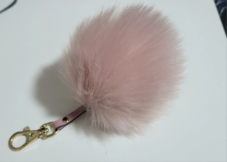 A pink fur pom pom attached to a gold coloured keychain. The pom pom has a leather strap. Cash only Pick up only