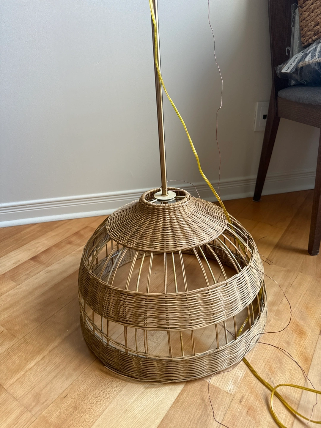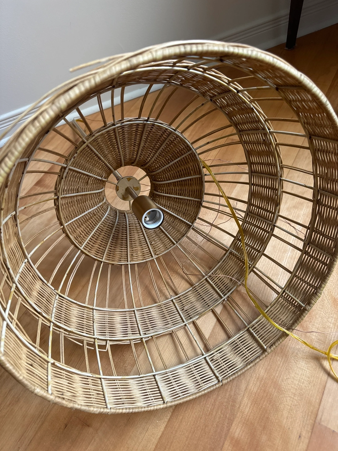 A woven wicker pendant light with a gold-toned finish. This light fixture is perfect for adding a touch of rustic charm to your home. It is in excellent condition. The electrical cord is included. The light bulb is not included.