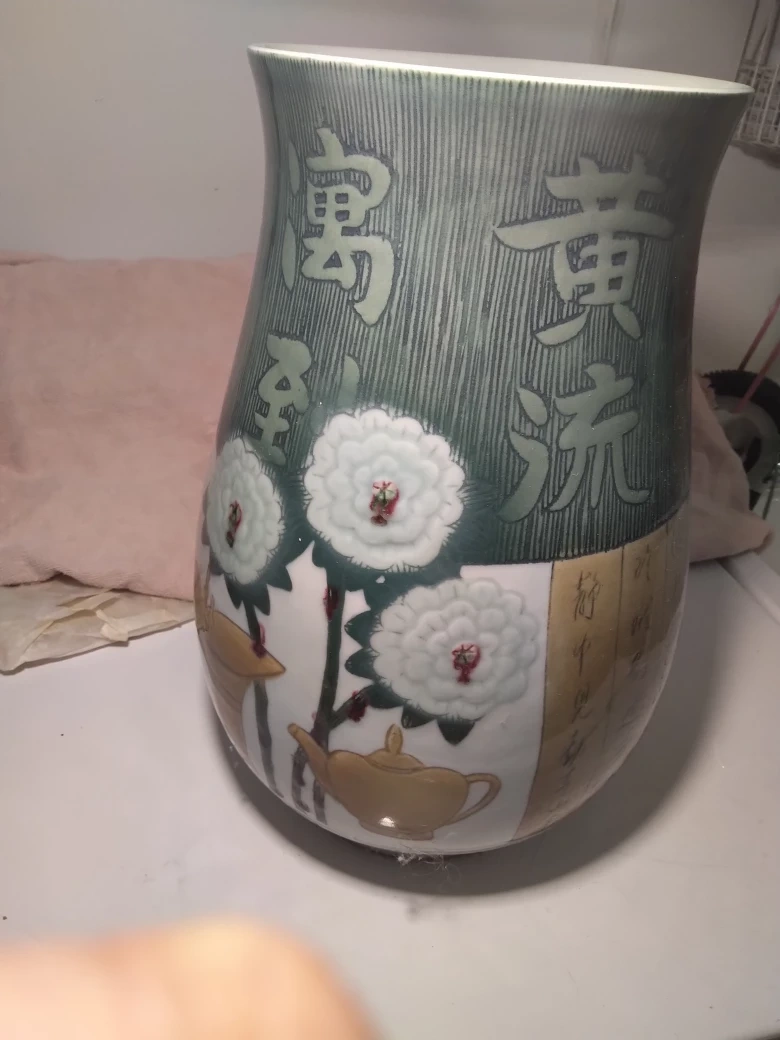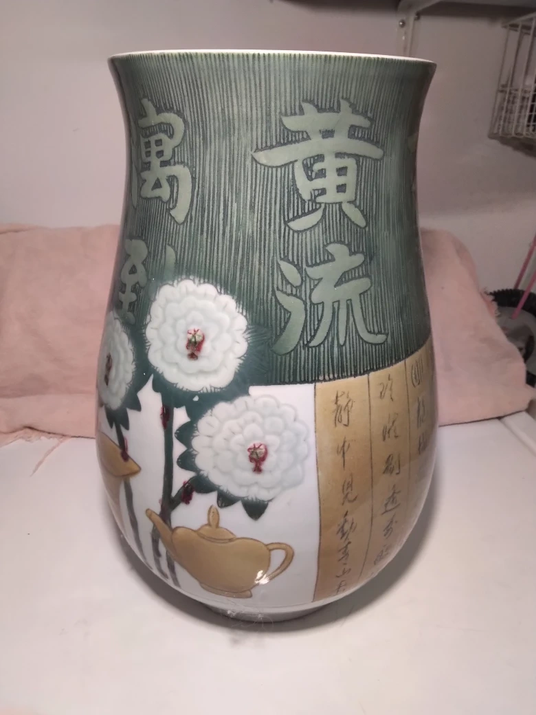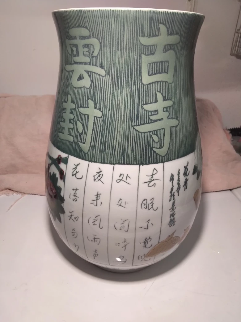 Large Chinese porcelain vase with intricate designs and calligraphy. It stands approximately 14" tall. It is in good condition with no chips or cracks. It is a beautiful and unique piece.