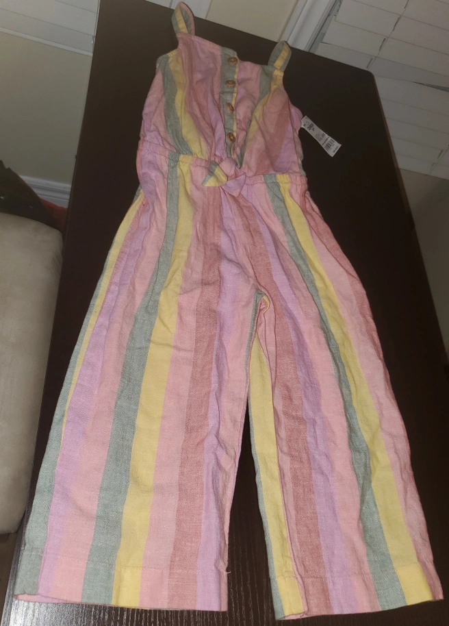 *firm price* Selling brand new cute striped jumpsuit for girls. It is sleeveless and has a button up front. The legs are a wide leg crop style. This is a size 6X. Has never been worn. Unfortunately, my child didn't get the chance to wear it.