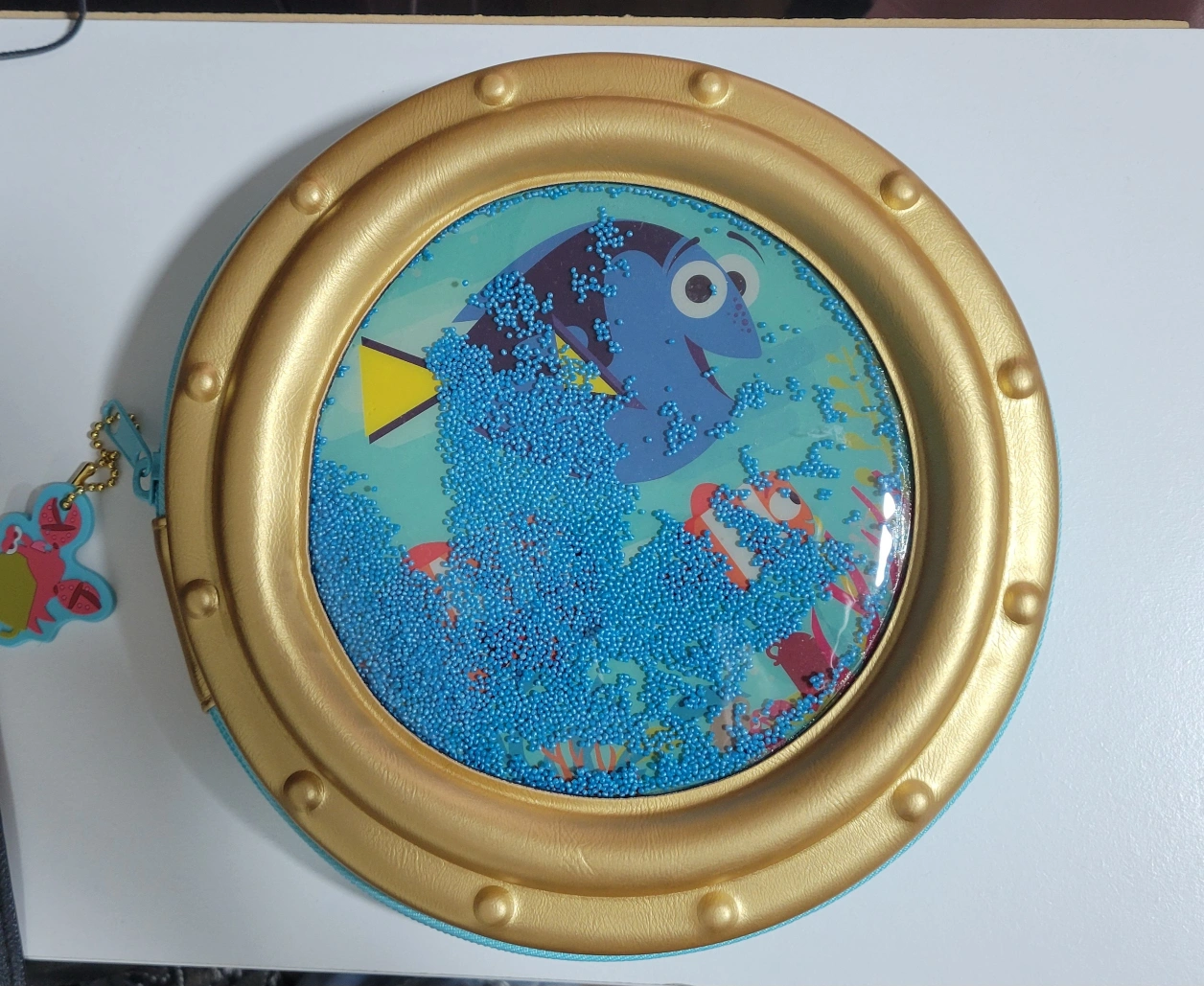 This is a Finding Dory pencil case with a variety of writing utensils. The case is round with a clear plastic insert that shows Dory swimming in the ocean. The case opens with a zipper and has a variety of compartments. The set contains coloured pencils, markers, and a pencil sharpener, eraser, ruler, and scissors. Used. Good condition. Pick up only Cash only