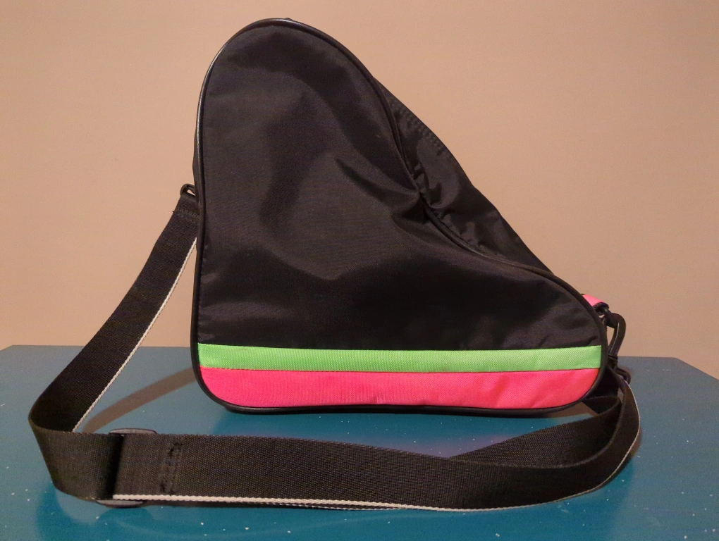 Black stylish skate bag with pink and green trim. Has a long adjustable strap. Zipper closure. Good for carrying rollerblades to the rink. It also fits women's ice skates snuggly. pick up at the Etobicoke Civic Center or outside Union Goodlife
