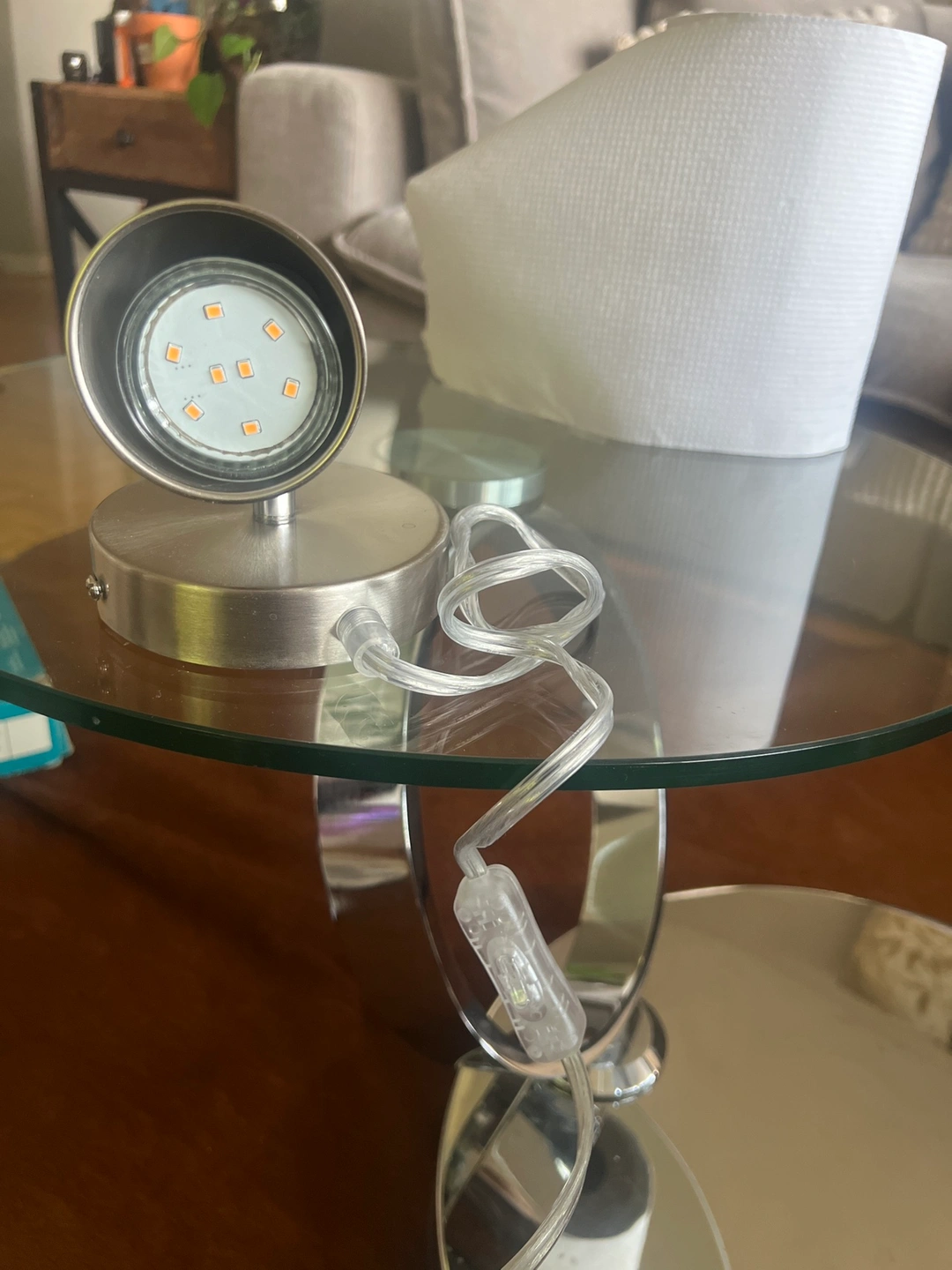 Small, silver LED plug-in light with a clear cord and an inline switch. This light has multiple bulbs and a swivel head to direct the light. It is ideal for a bedside table, desk, or other location where a small amount of extra light is needed.