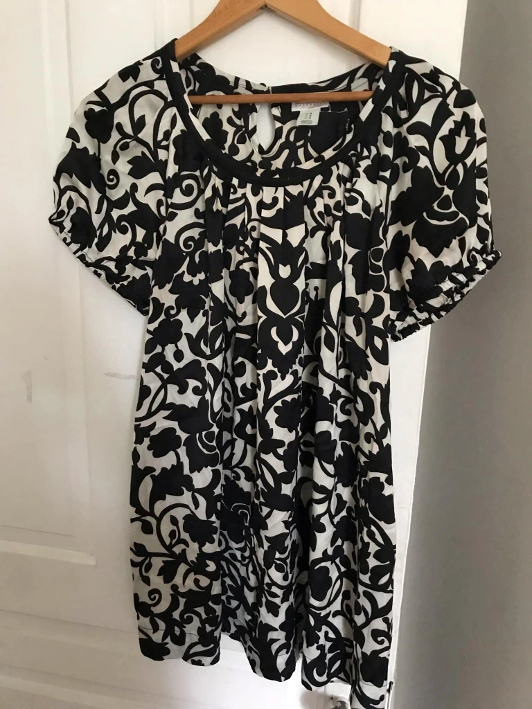 Black and white floral print top with short sleeves and a round neckline. motherhood maternity top, missing belt but looks better a line shape size medium used great condition $10