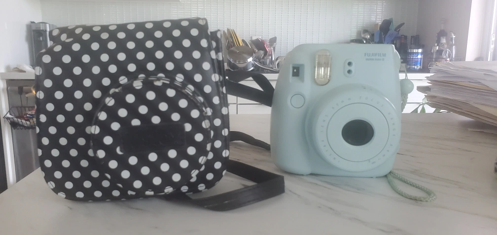 Blue Fujifilm Instax Mini 8 camera, comes with a black and white polka dot camera case. A great gift for someone looking to take photos! I also bought a polka dot bag for it separately. I just bought a similar but different so d9 not need 2. Reg, $89.99 +$19.99