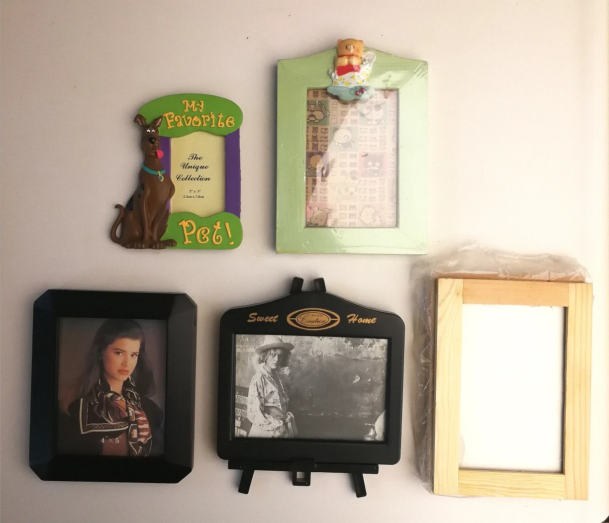 Assorted picture frames, new or like new conditions bundled price $10 for all or buy individually with price below: Brand new package of 3 IKEA wood frames for 4" x 6" photos, glass cover. Package was opened but never used, can leave as raw wood or paint or decorate with your own design: $5 Like new black wooden 4" x 5" picture frame from Black's photo, glass cover, never used: $2 Sweet Home black 4" x 6" frame with holder in used good condition, glass cover: $2 Brand new in box green bear 4" x 6" picture frame, plastic cover: $2 Brand new in box Scooby-Doo 2 1/4" x 3 3/8" picture frame, plastic cover : $2 pick up in downtown close to St Patrick station, Dundas-University area