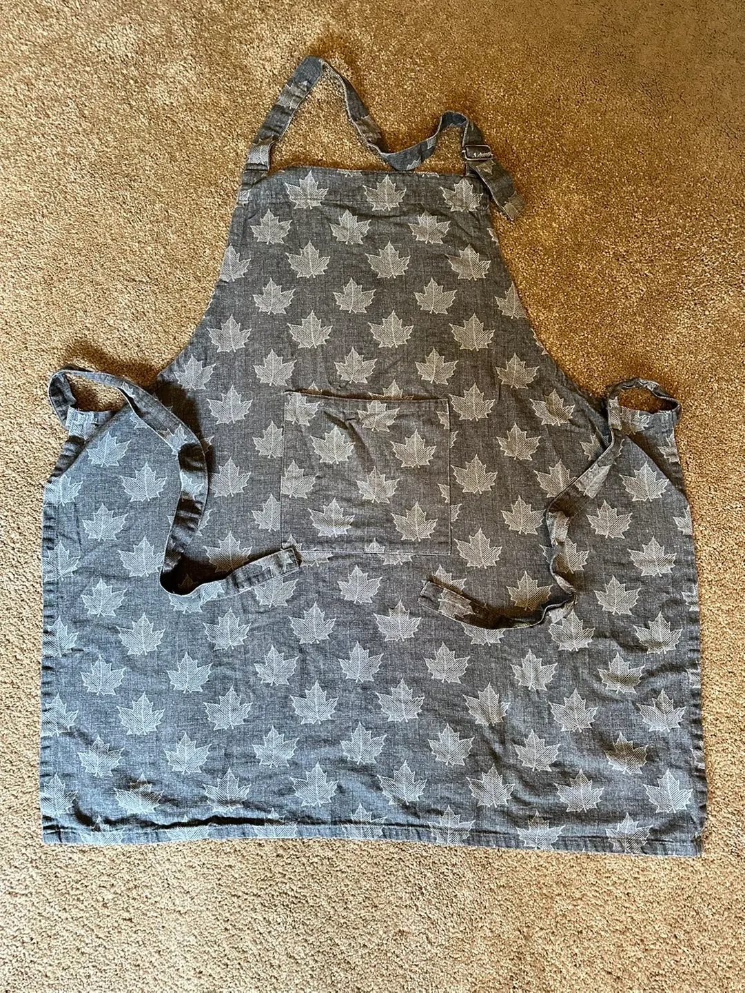 A grey apron with a white leaf pattern. It has an adjustable neck strap and tie waist straps. It also includes a front pocket. š” Please check out my other listings, you may want to bundle with other stuff Thank you.