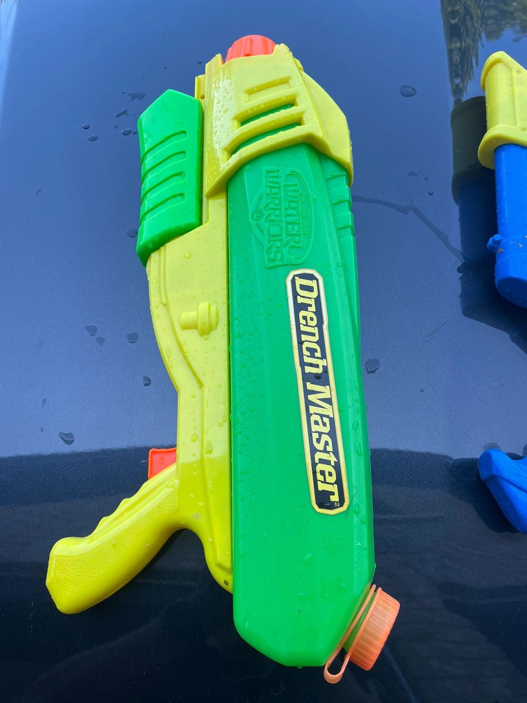 Green and yellow water gun. Features a large tank on the back. Water Warriors logo and Drench Master label are visible on the side. Orange cap at the top. I have 6 water gun. $2.5 for each. They are in good condition