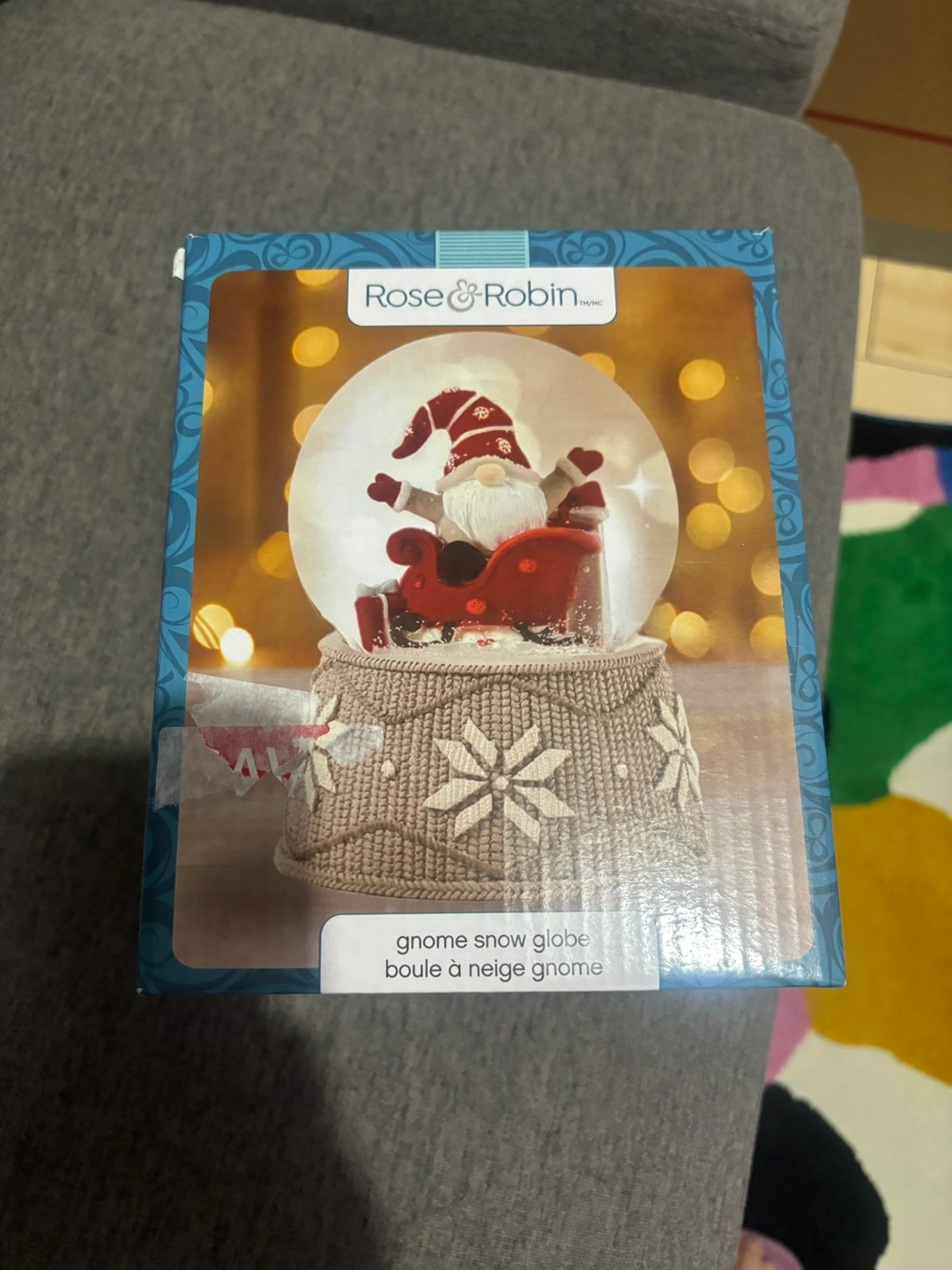 Gnome snow globe with a gnome riding in a sleigh. The snow globe is in a woven base with a snowflake design.