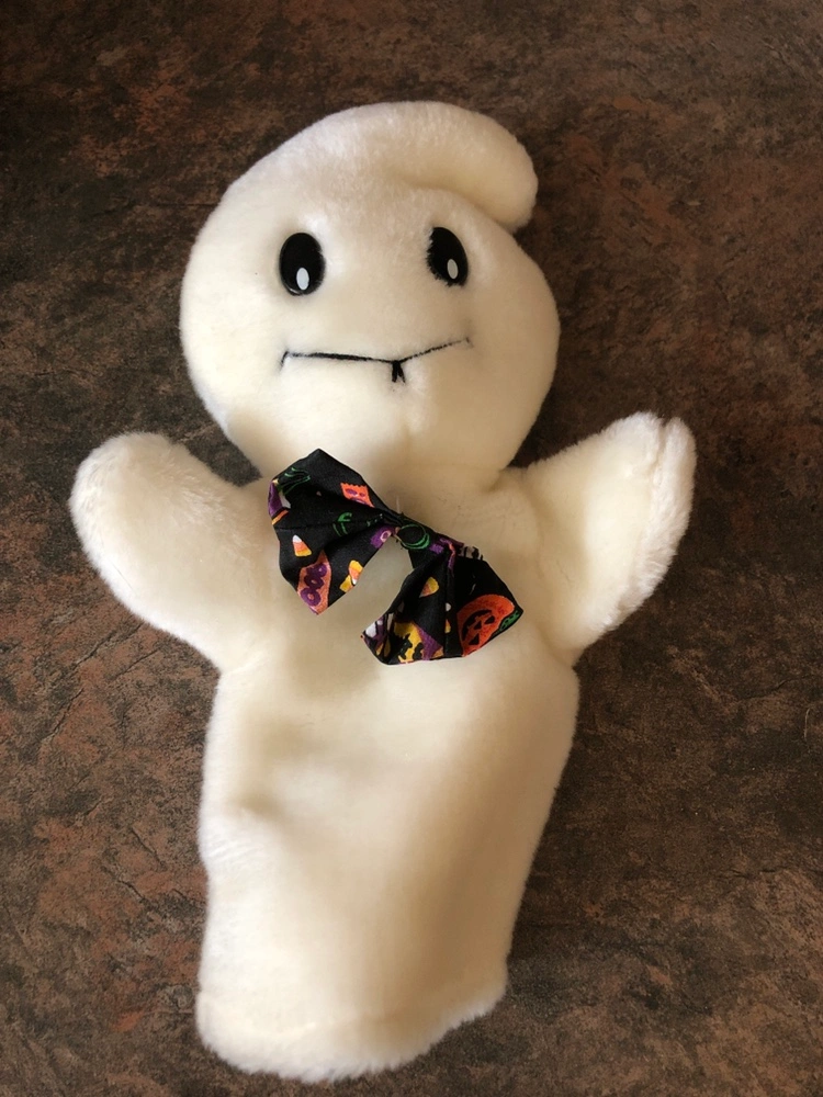 White ghost hand puppet with a Halloween themed bow tie. The ghost has a friendly face with black eyes and a cute smile. Great for children or Halloween decorations.