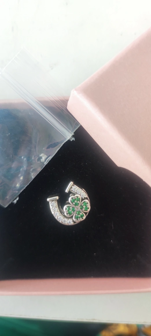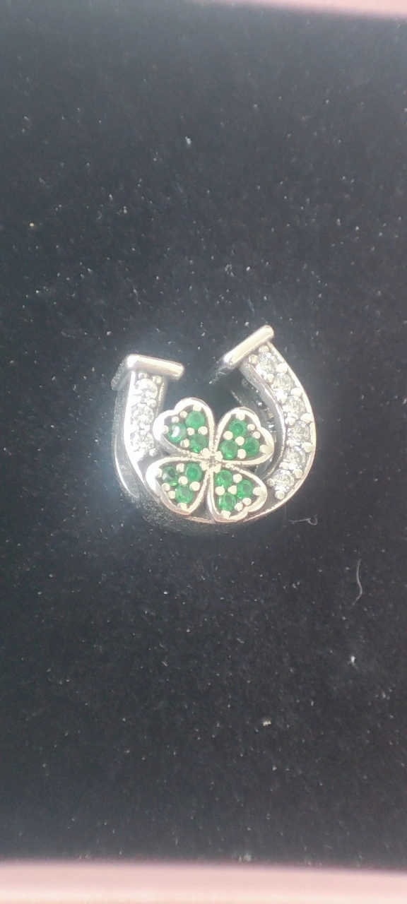 This charm features a horseshoe with a four-leaf clover in the centre and clear stones around the horseshoe. It is marked S925 on the back.