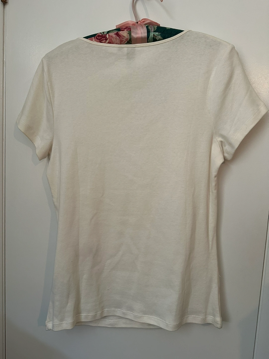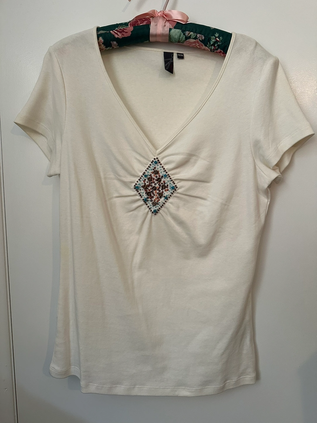 White, short-sleeved T-shirt with a beaded embellishment on the front. Brand new, smoke free home