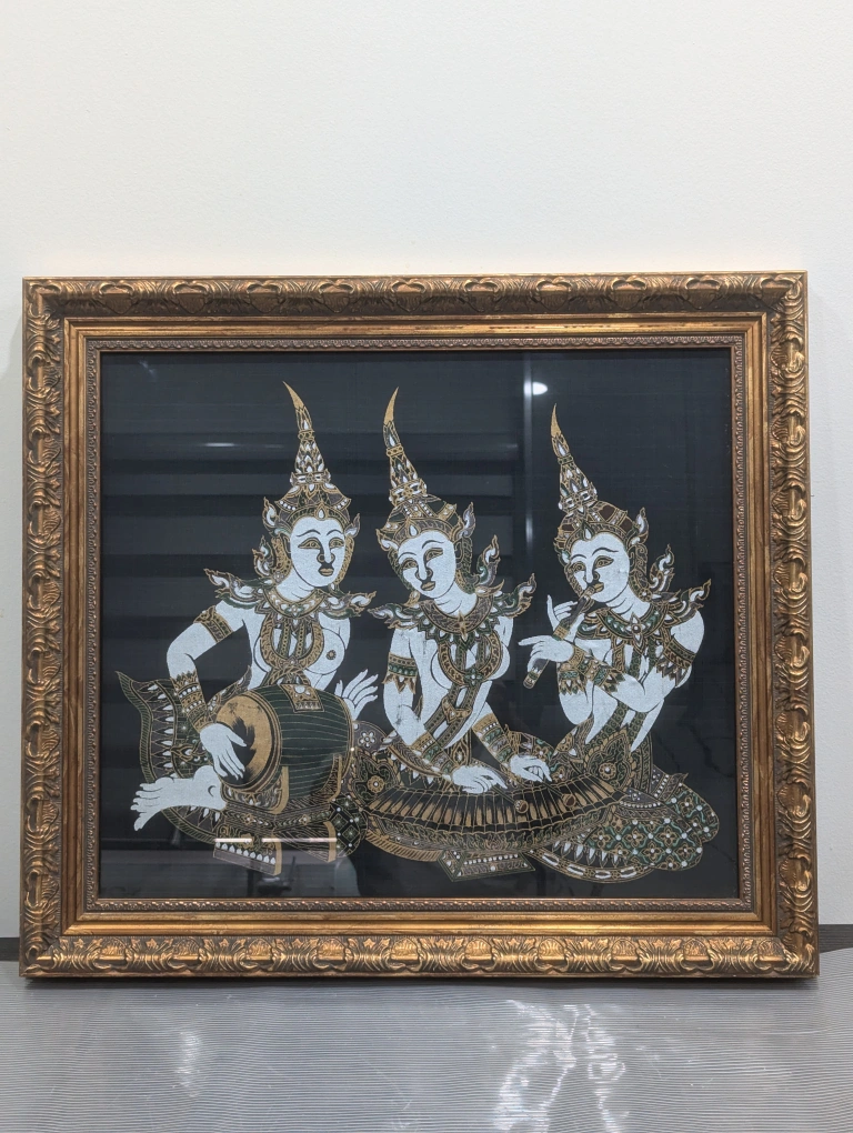 A framed artwork depicting three figures playing instruments, set in a gold-colored frame. The piece measures approximately 24 by 21 inches.