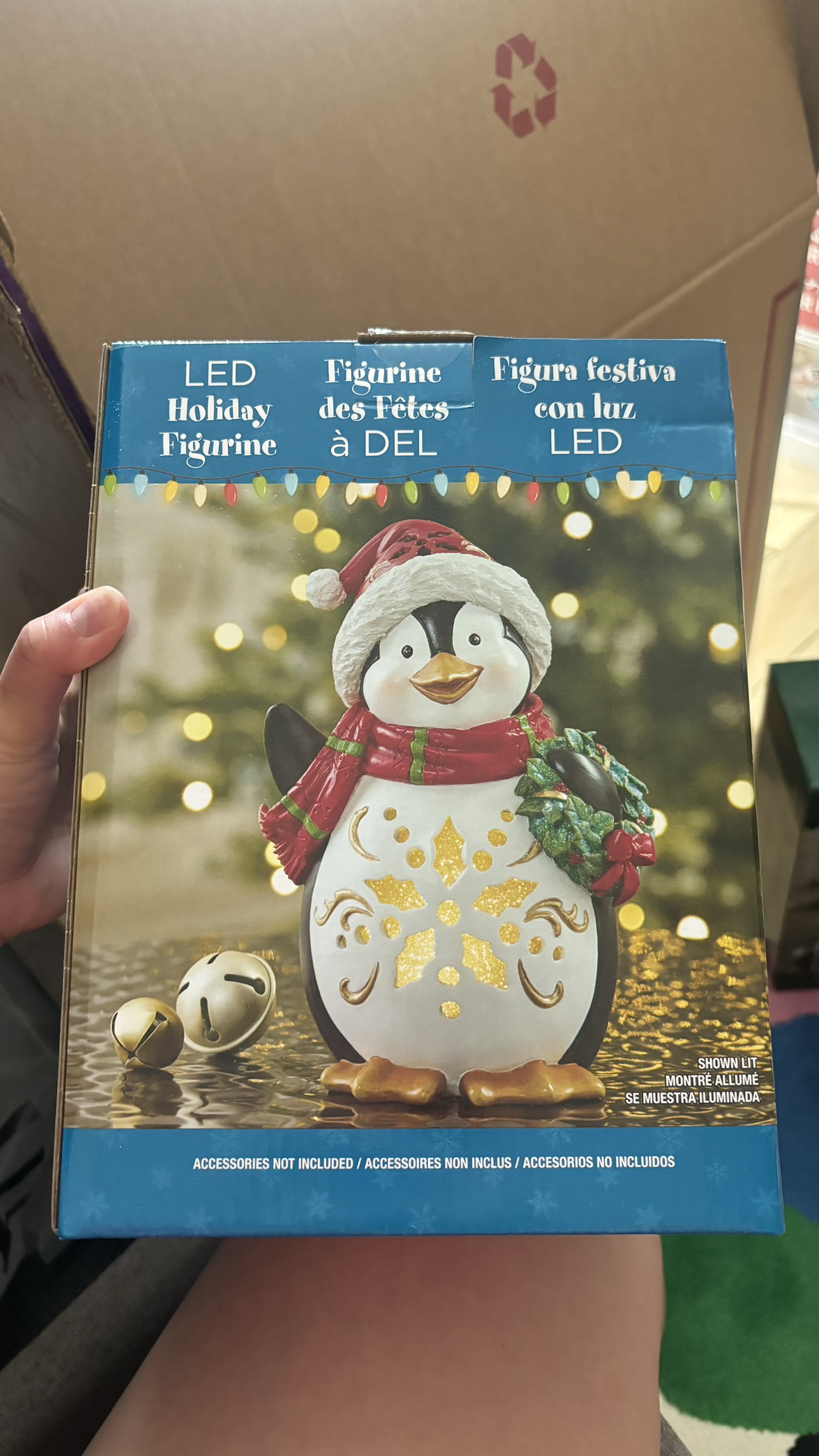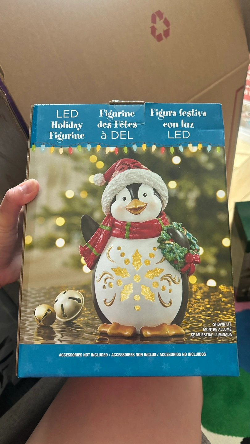 This is a boxed LED penguin figurine. It is wearing a Santa hat and a scarf. It has bells and a wreath. The lights illuminate the figurine's details.