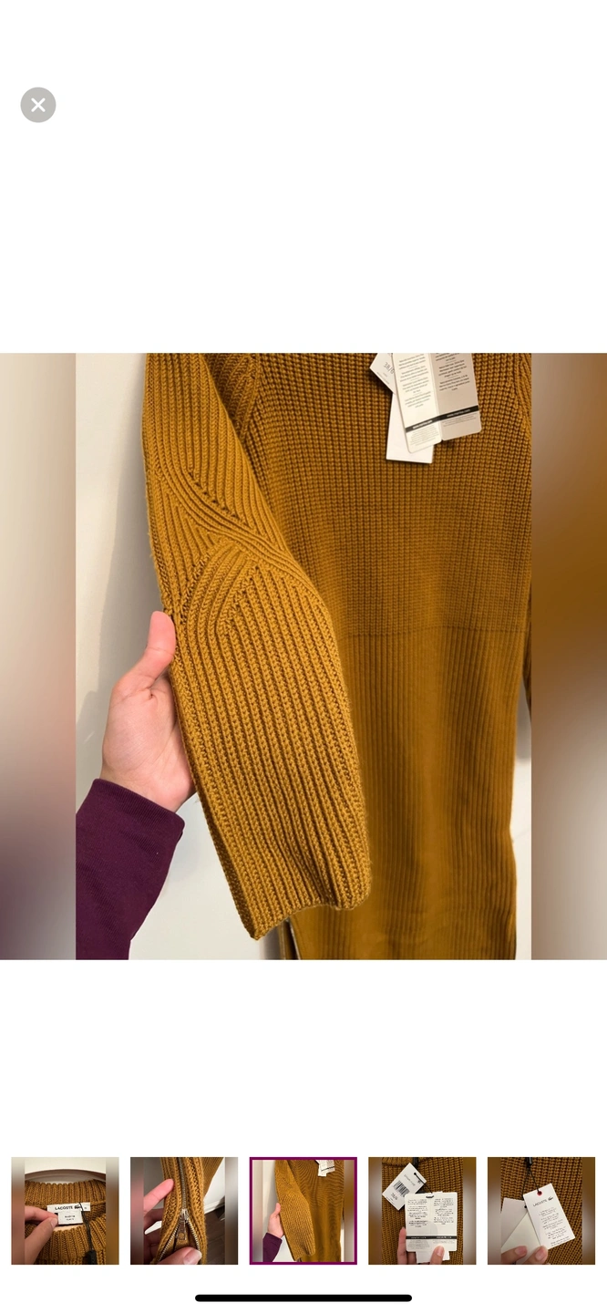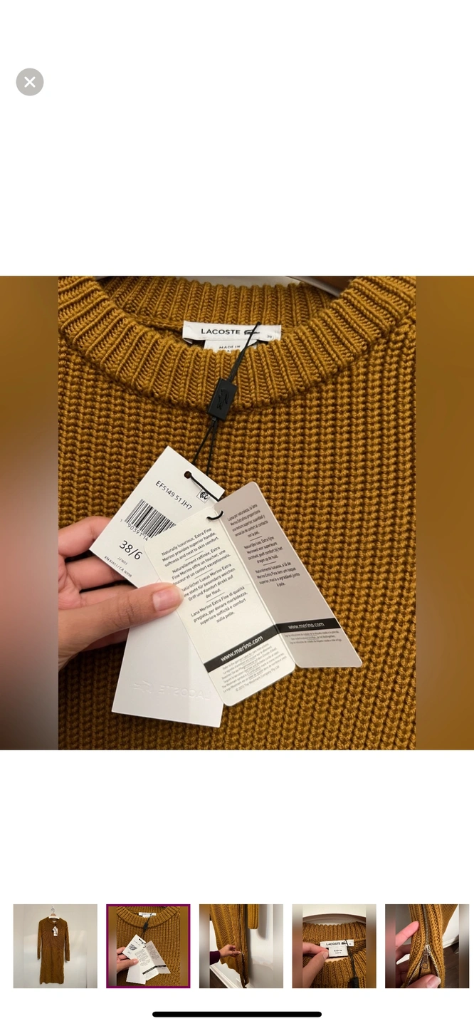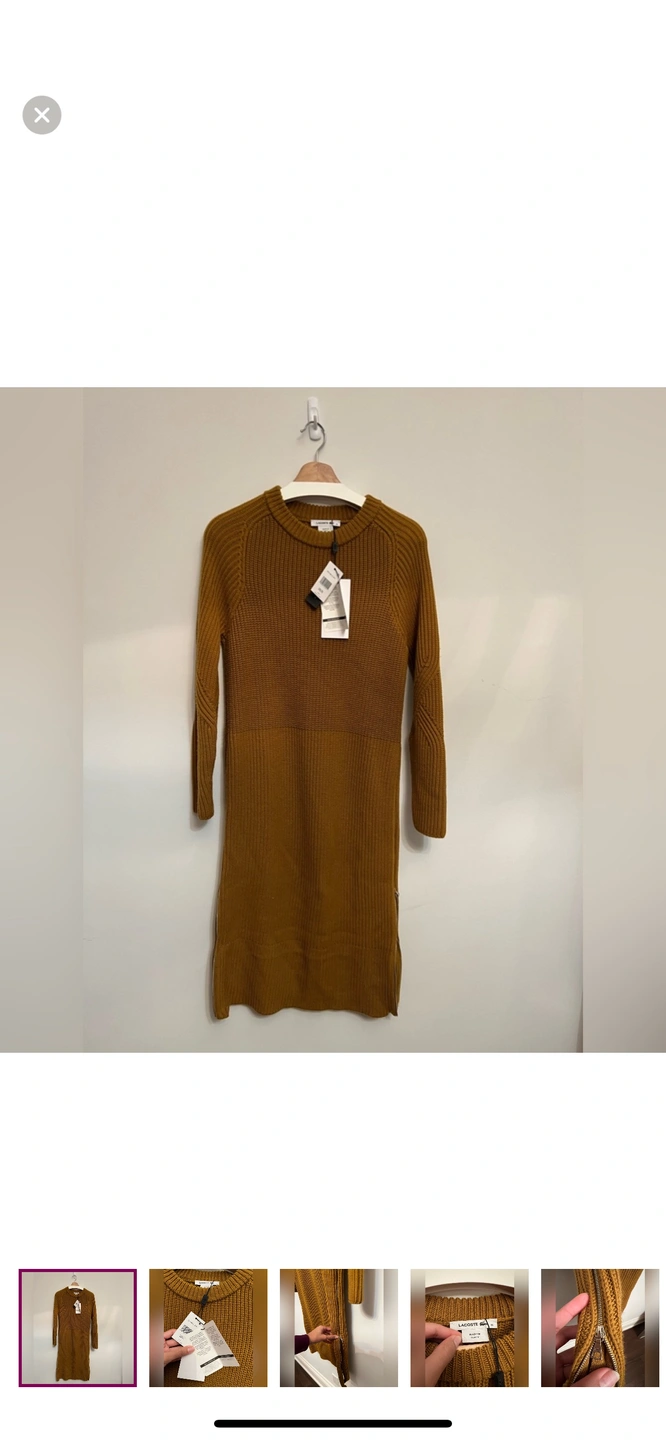 This is a beautiful Lacoste women's sweater dress, long-sleeved, ribbed, and in a brown colour. The dress has a small Lacoste crocodile logo on the chest and is made of a soft and comfortable wool blend. This dress is perfect for any occasion, whether you're dressing up for a night out or keeping it casual for a day of running errands.