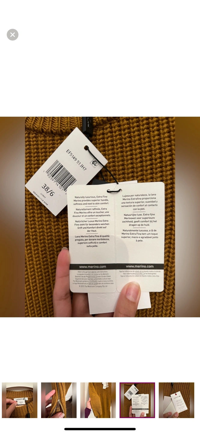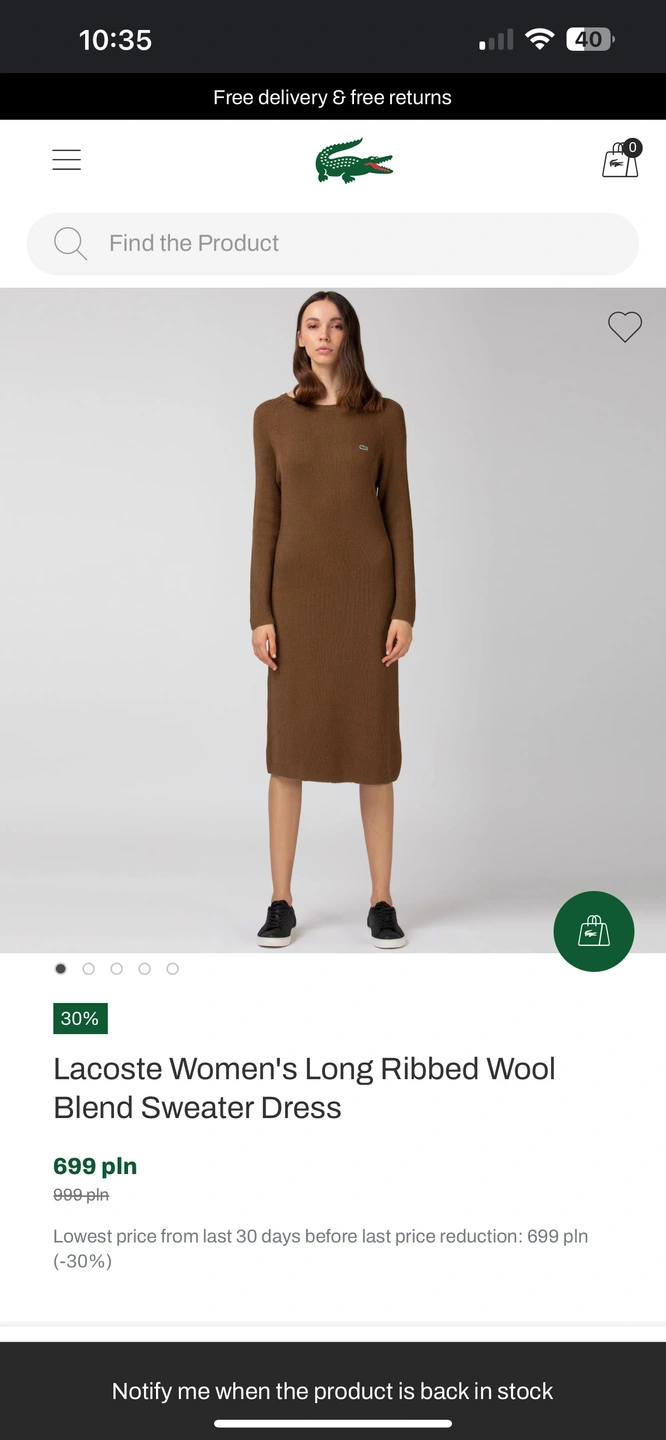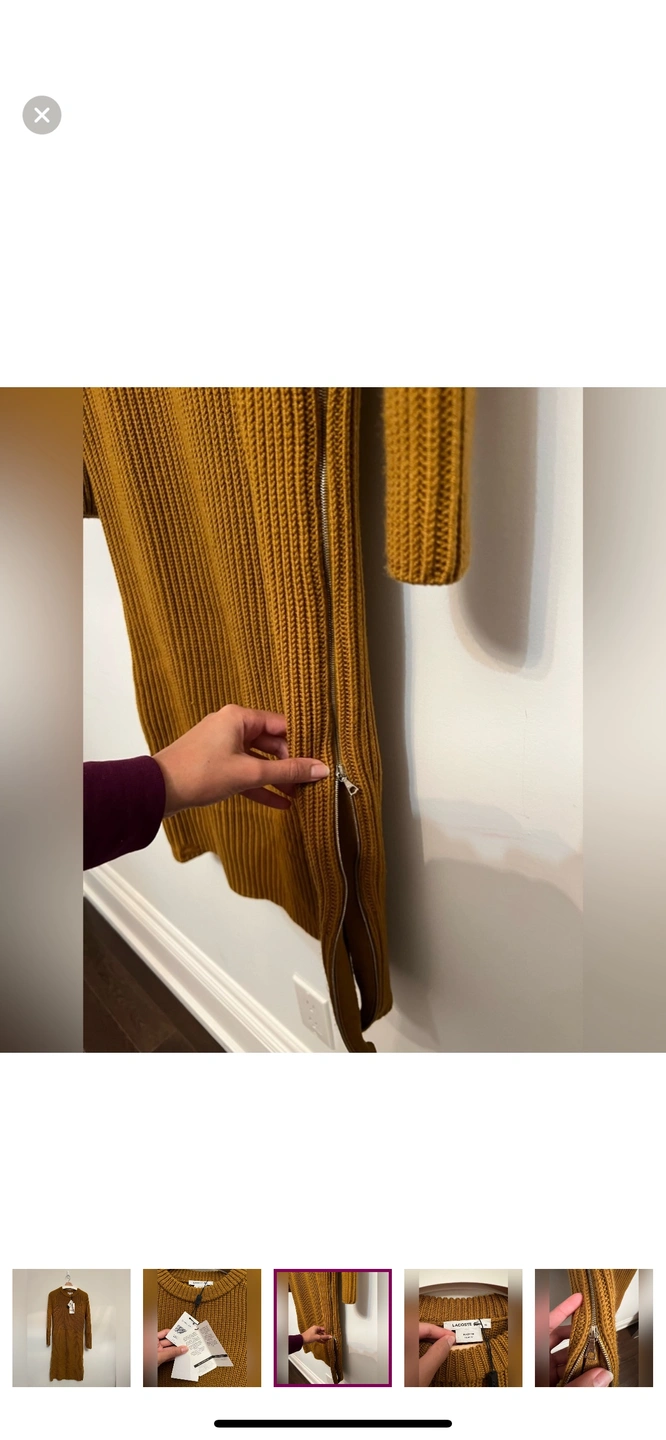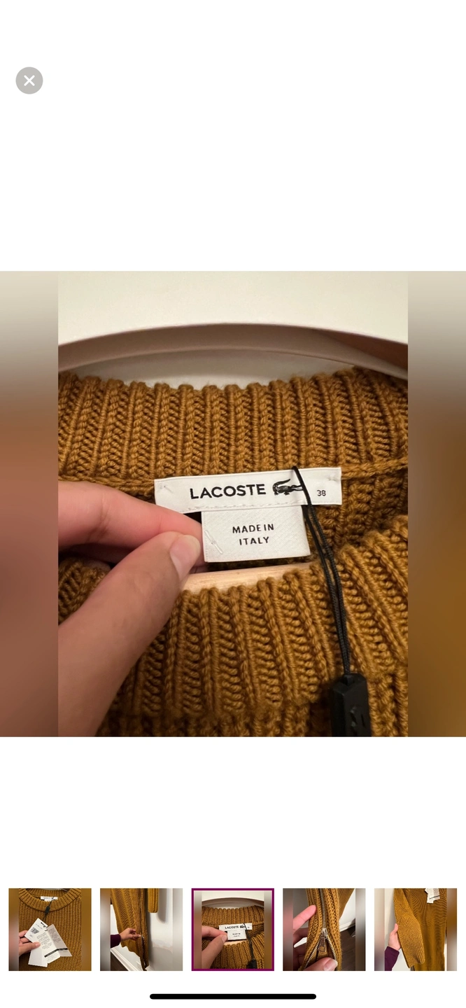 This is a beautiful Lacoste women's sweater dress, long-sleeved, ribbed, and in a brown colour. The dress has a small Lacoste crocodile logo on the chest and is made of a soft and comfortable wool blend. This dress is perfect for any occasion, whether you're dressing up for a night out or keeping it casual for a day of running errands.
