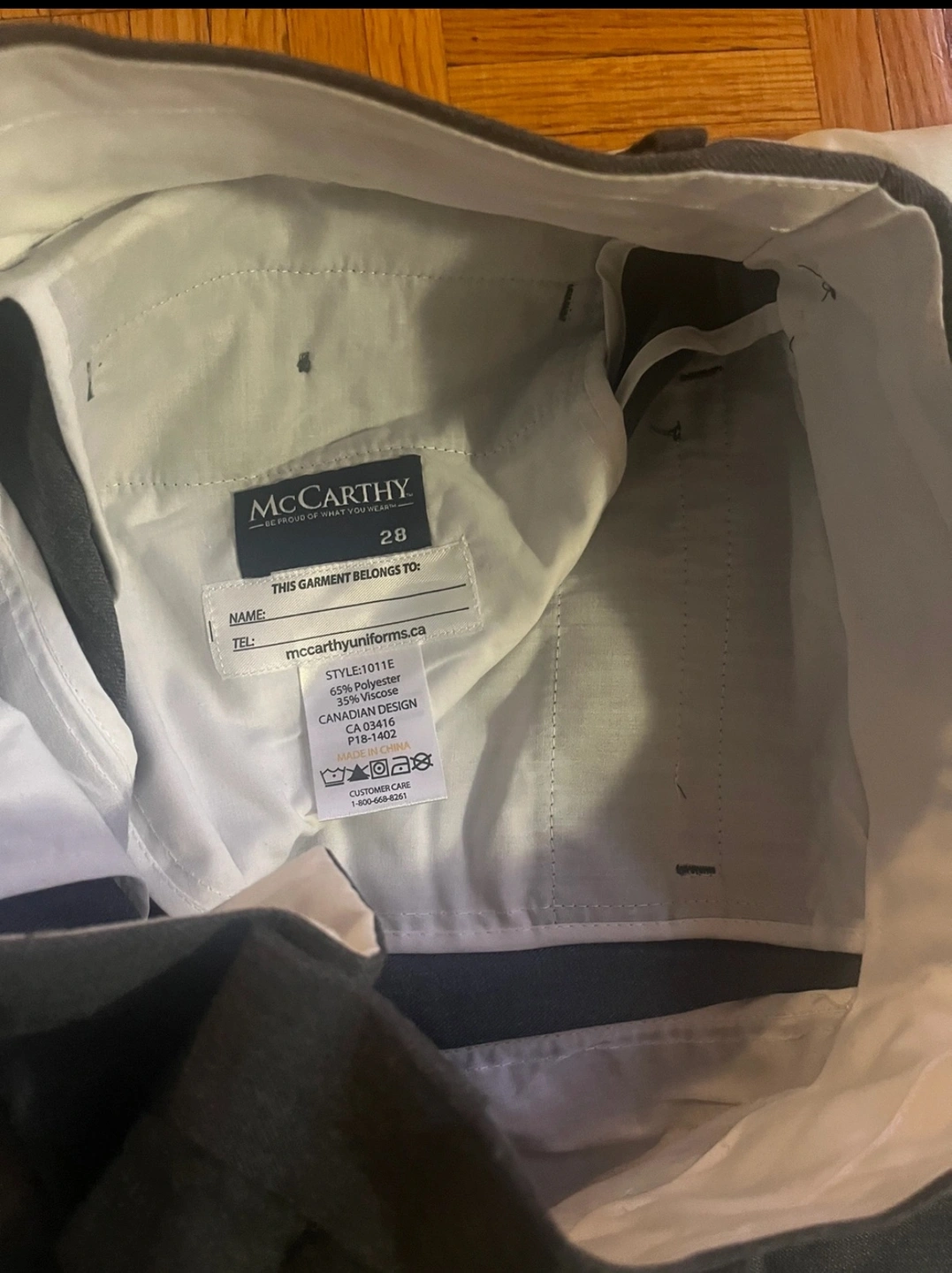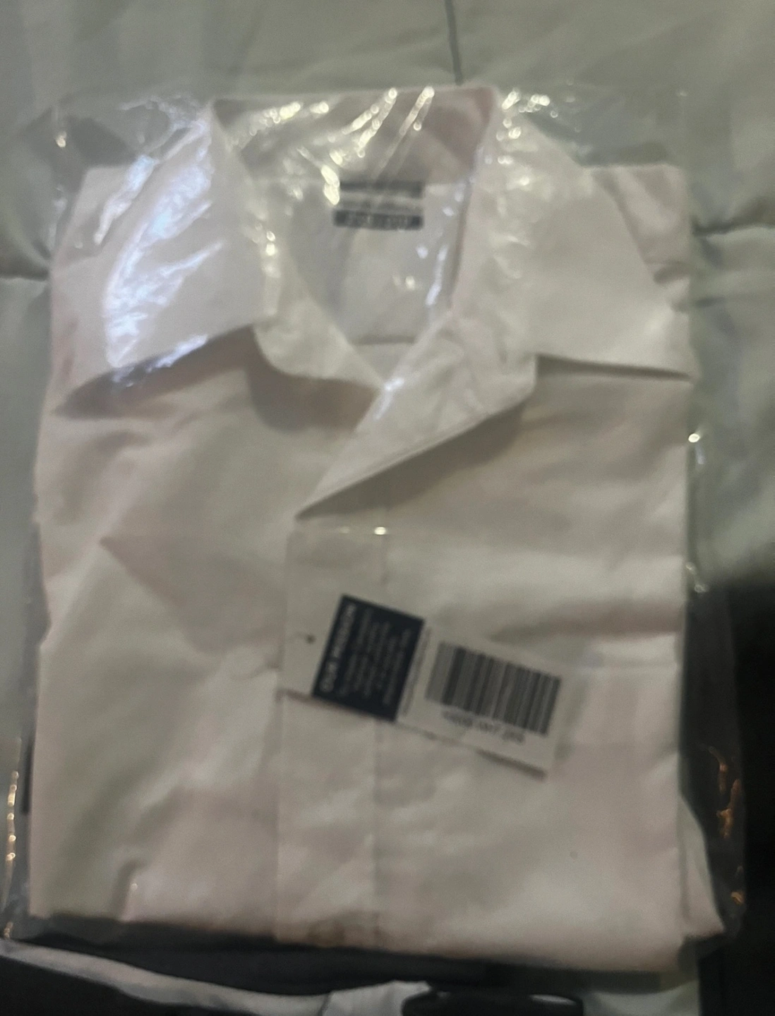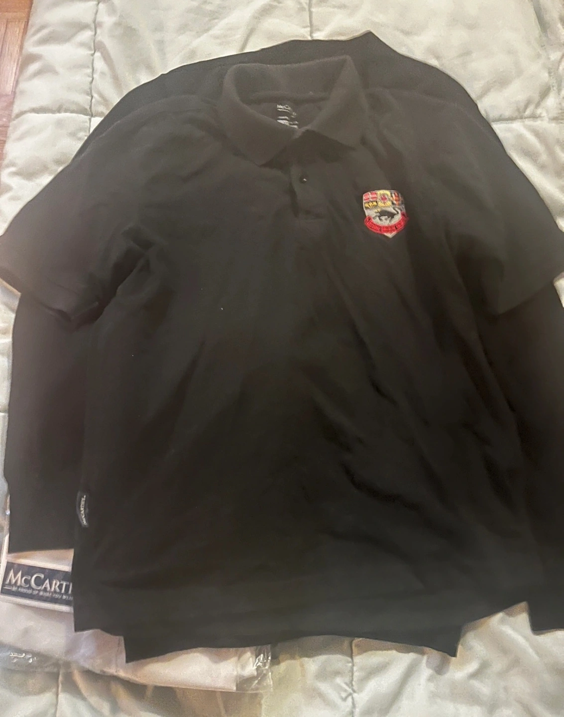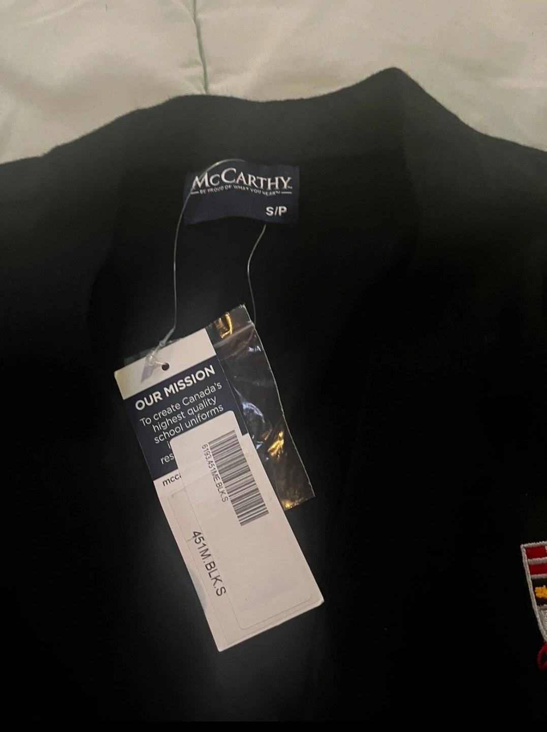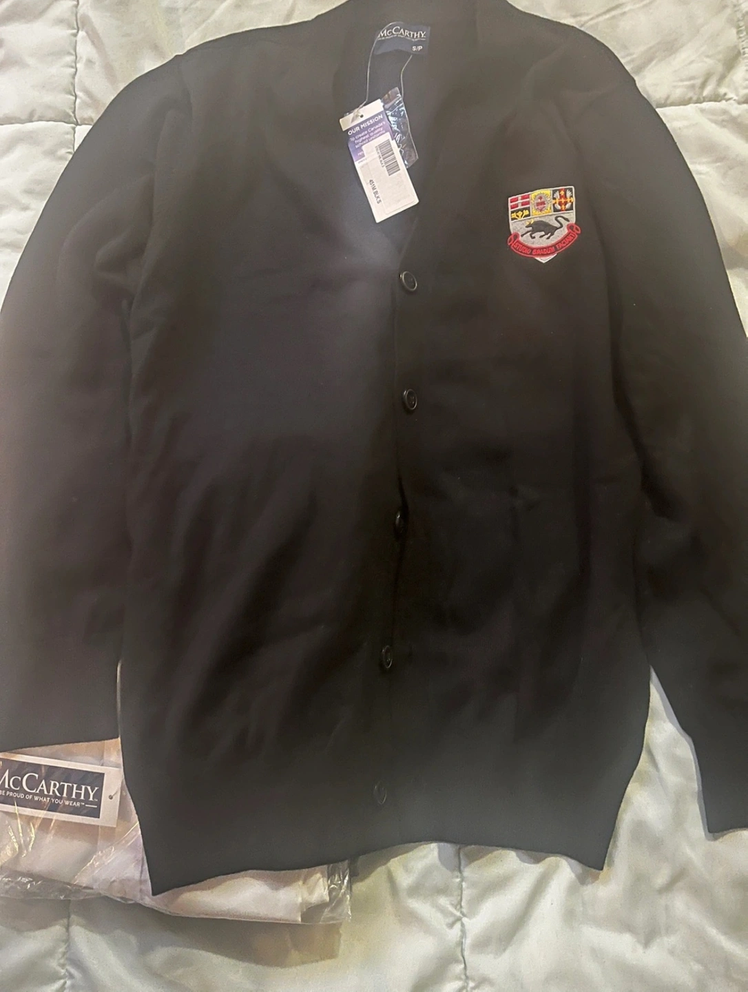 Black sweater with a red, yellow, and blue crest. White long-sleeved dress shirt. Both are size Small. Brebeuf College School uniform