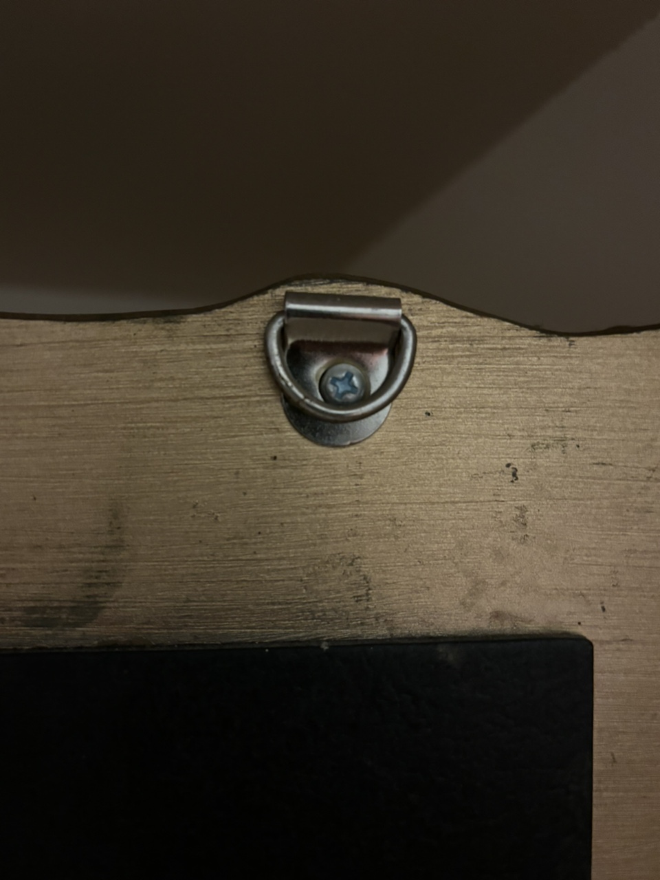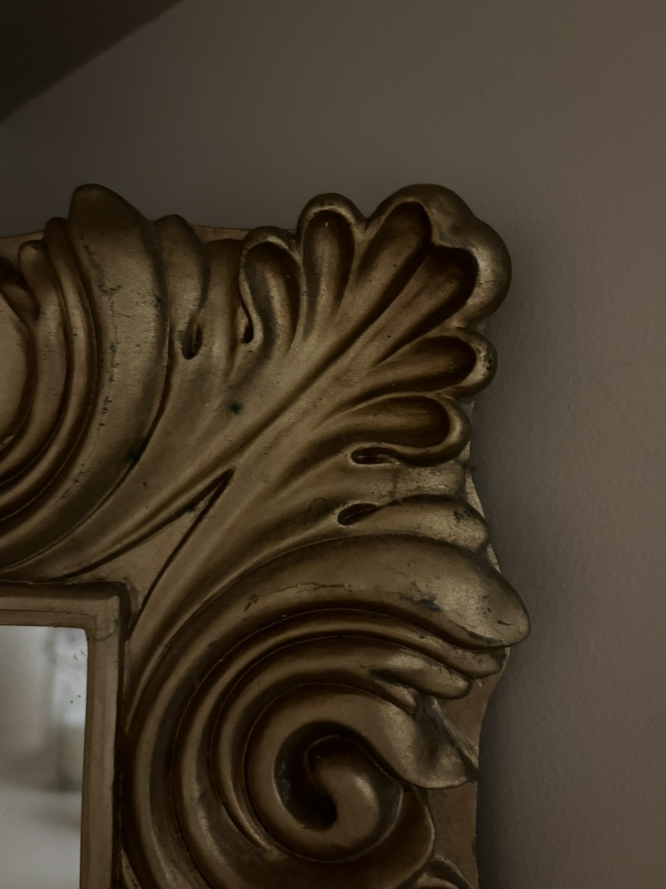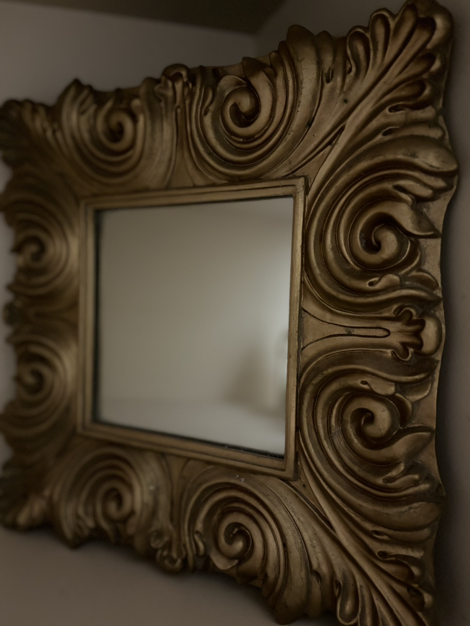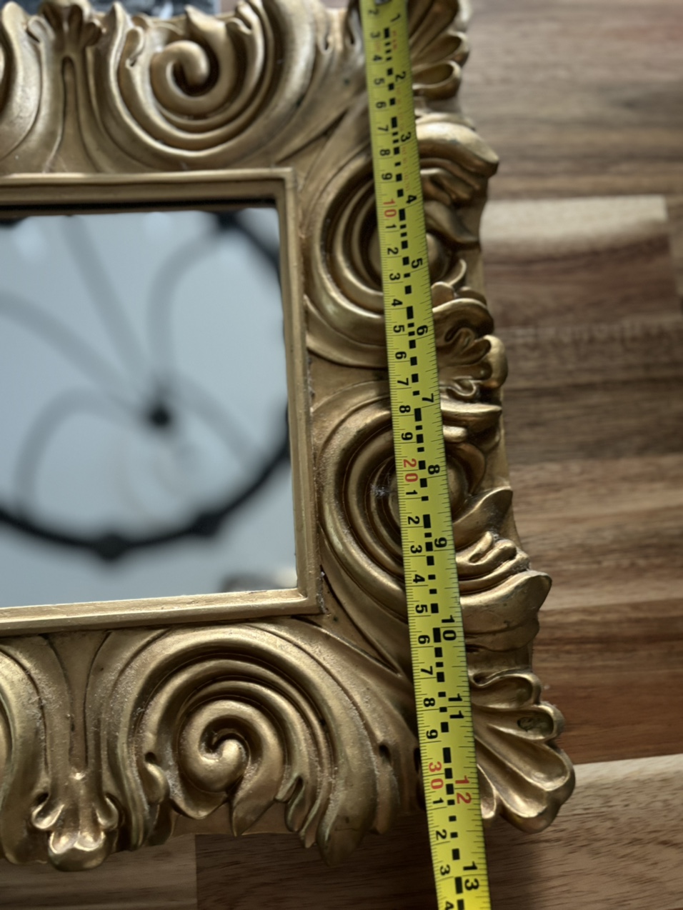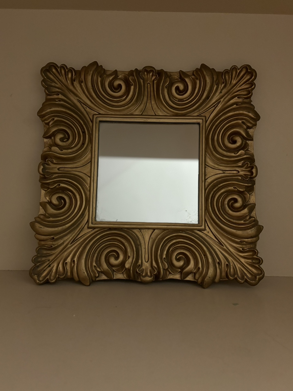 Square mirror with ornate gold frame. Has 2 hook hangers on back for hanging (as seen in photos)