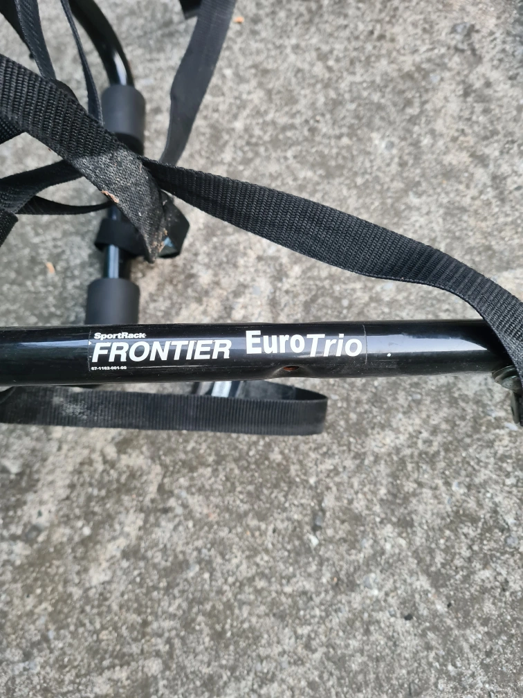 A used bike rack in good condition. The rack is designed to carry three bicycles. It has a sturdy metal frame and adjustable straps to secure the bikes. The rack folds for storage and comes with no instructions.