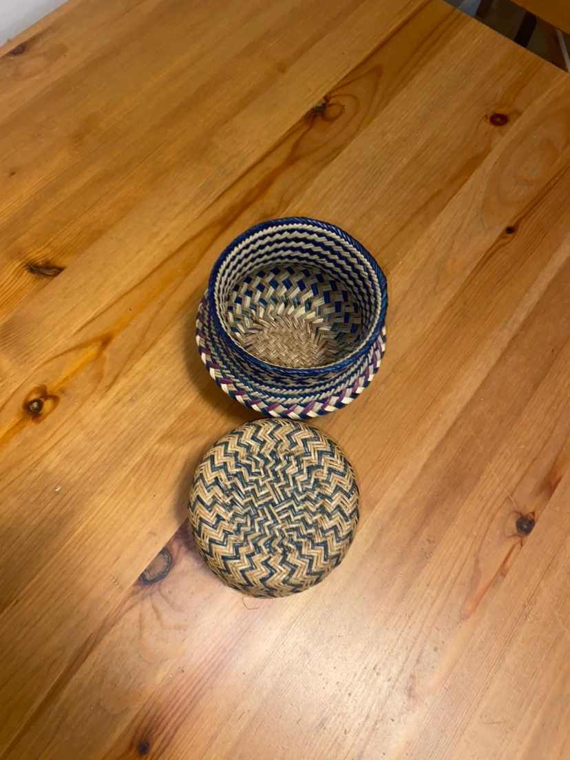 A small woven basket with a lid, featuring blue, purple, and natural colours. The basket is approximately 5 inches tall. Hand woven. #freecycle