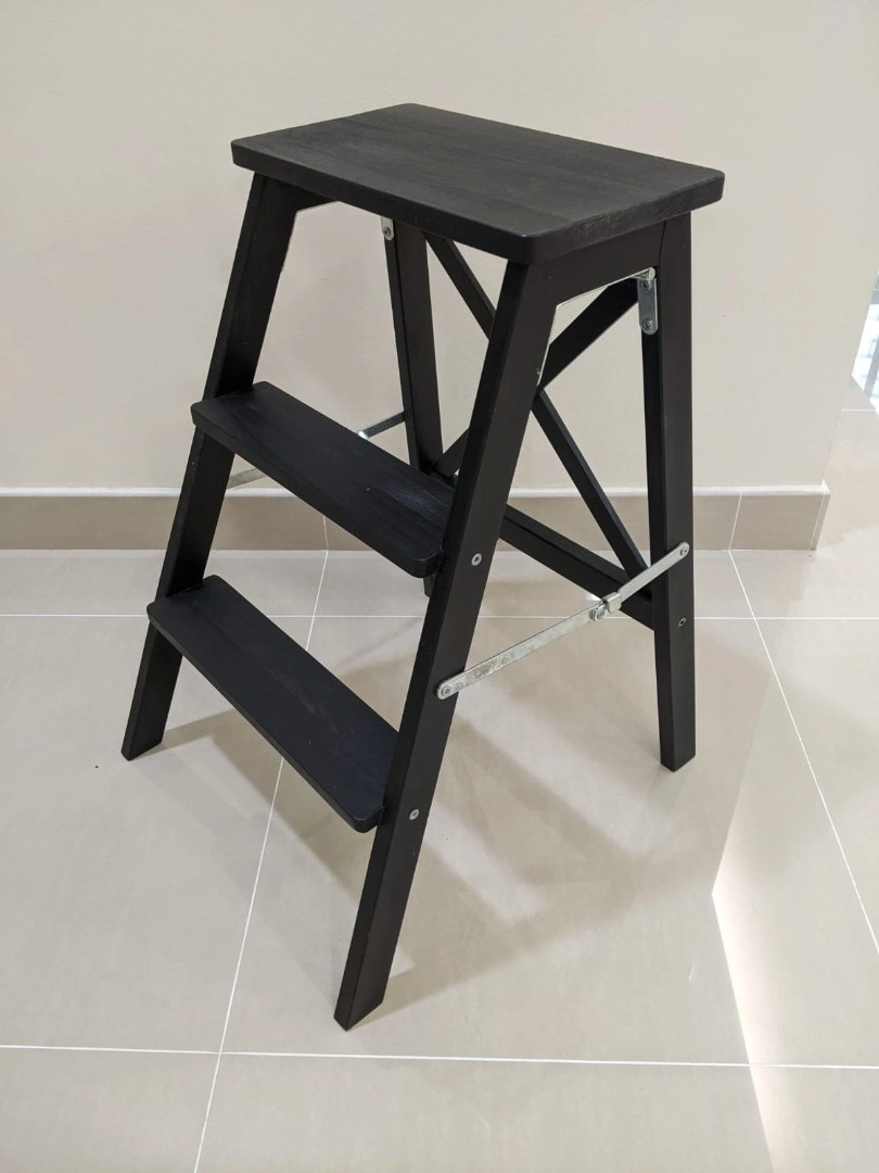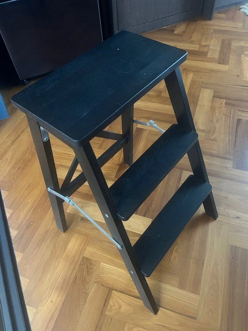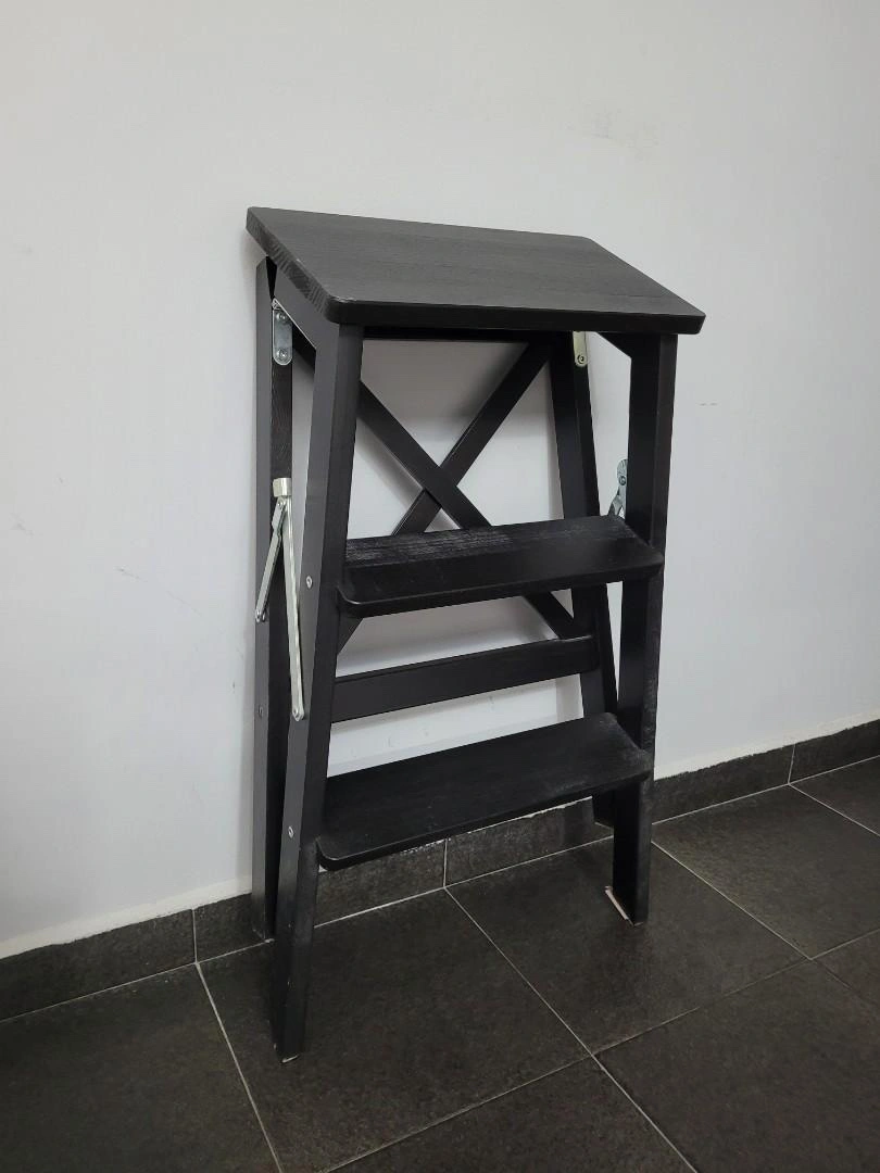 A black wooden step stool with three steps and metal hinges. Can be used as a stool to sit on. It folds for easy storage. Good for reaching high places in your home or for use in your garden. Responding to Serious inquiries only. If ad still up, then it’s available. ▶️Price firm ▶️serious inquiries only. ▶️Pick up only ▶️final sale. 💵cash payment with exact change.