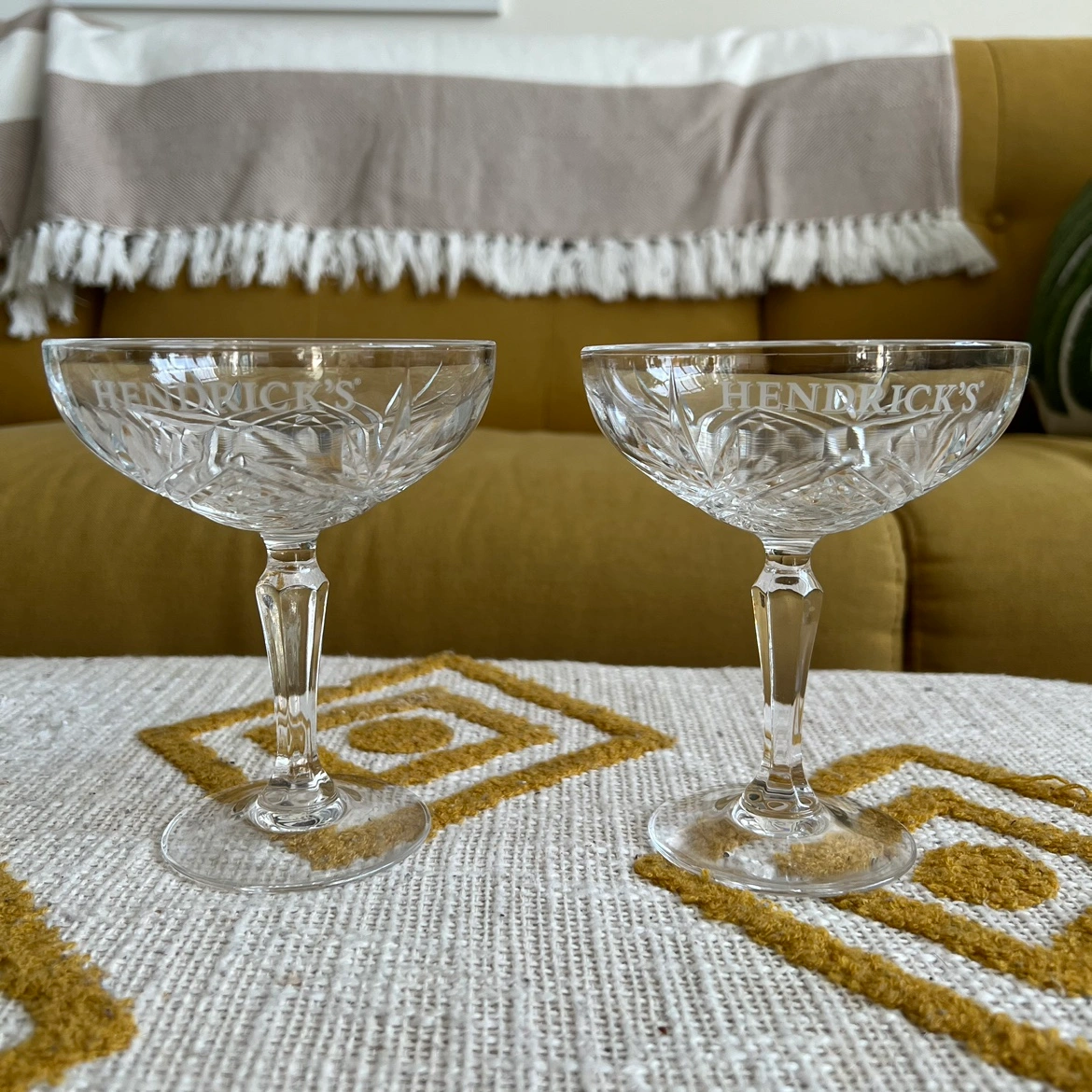 Set of two etched glass Hendrick's Gin glasses. CONDITION: LIKE NEW ( used 1x) ** if listing is still up the item is available ALL SALES FINAL SERIOUS INQUIRES ONLY PLEASE :) PICKUP ONLY - PRIORITY TO QUICK PICKUP AND/OR BUNDLES LOCATION: DOWNTOWN ( RICHMOND/ GEORGE ST) Check my listings for more and follow for new items almost DAILY😀!!!