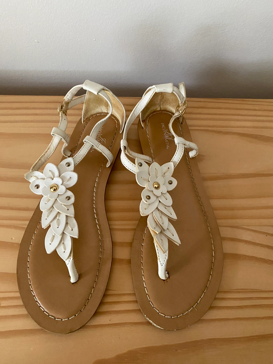 •Size: 7 •Make: Jaclyn Smith • Ankle strap, toe thong (see pic) •These are a comfortable and stylish pair of sandals •White leather upper with a flower accents and a comfortable brown footbed •smoke-free, pet-free environment ⬇️⬇️⬇️⬇️⬇️⬇️⬇️⬇️⬇️⬇️⬇️⬇️⬇️ •Location: Jane & Lawrence