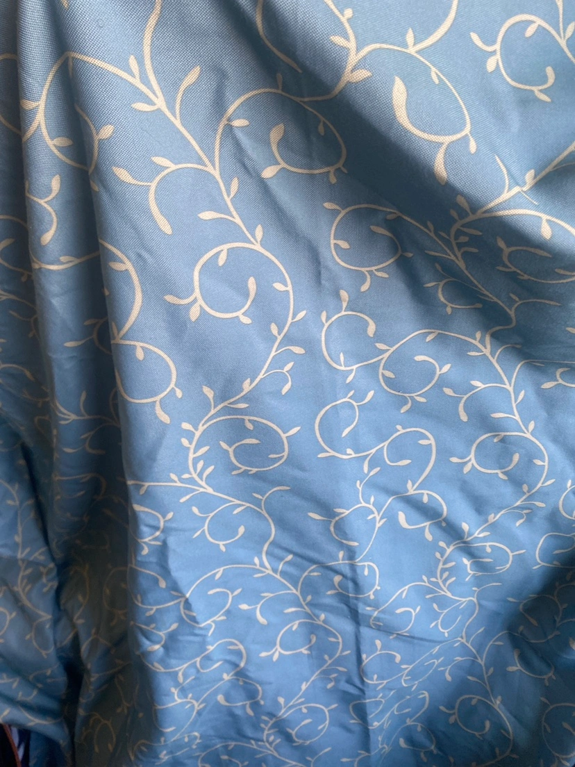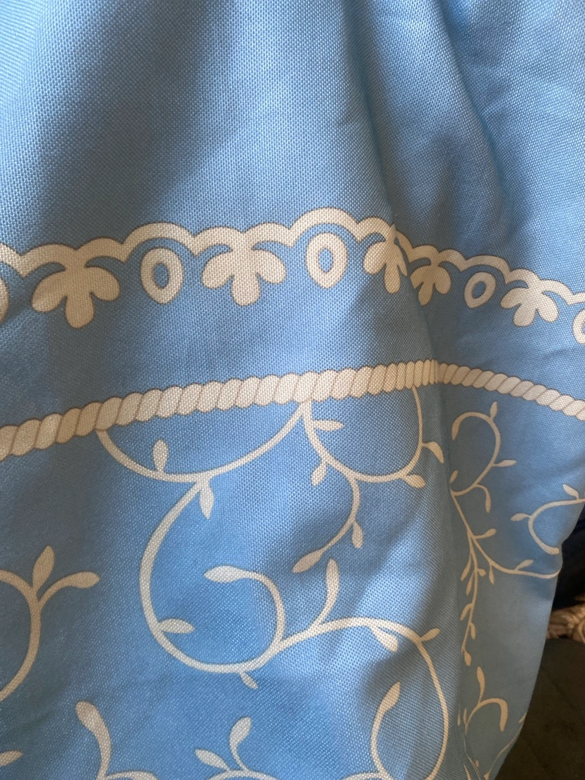 Light blue shower curtain with beige rope design and beige vine pattern.