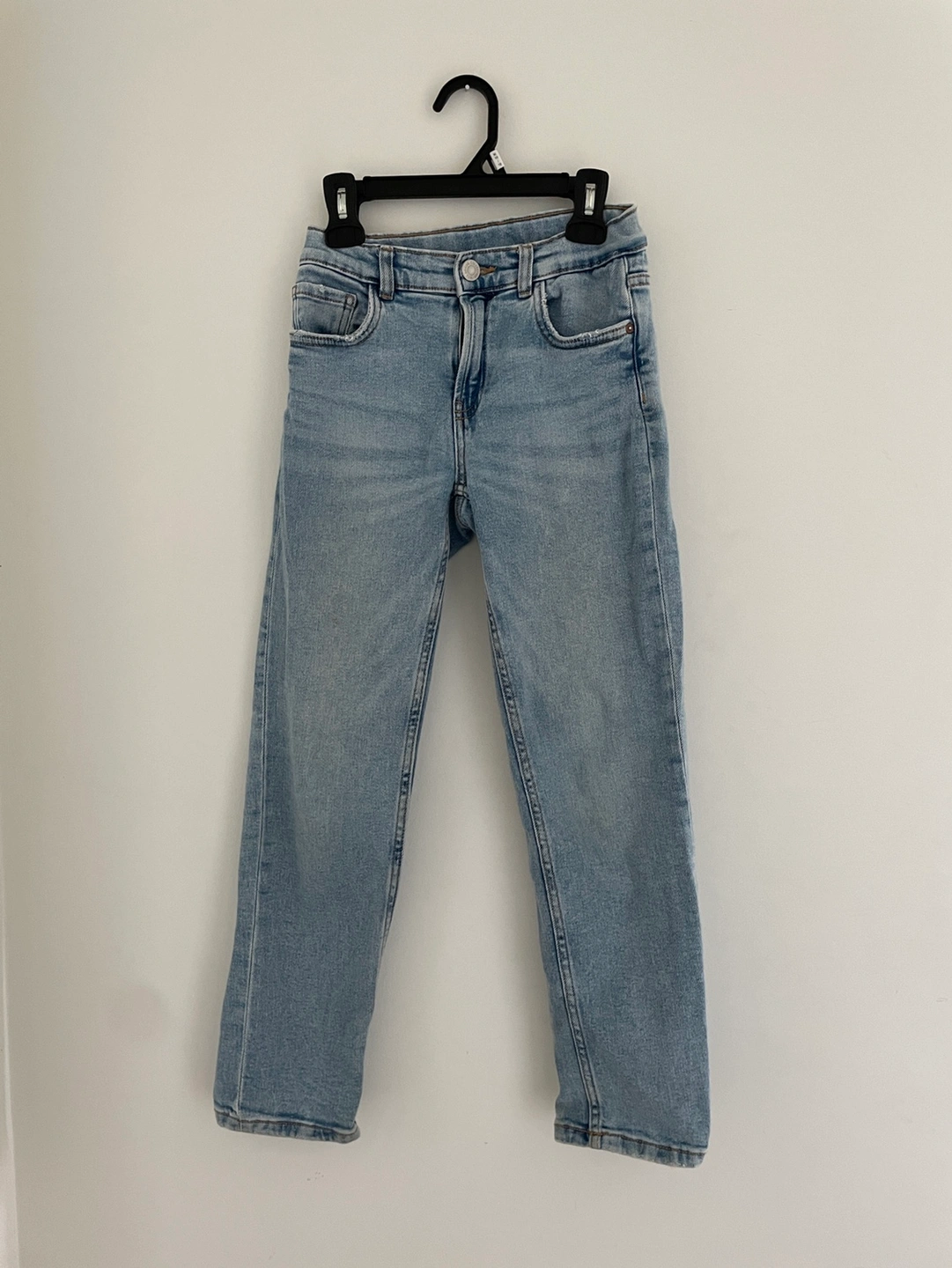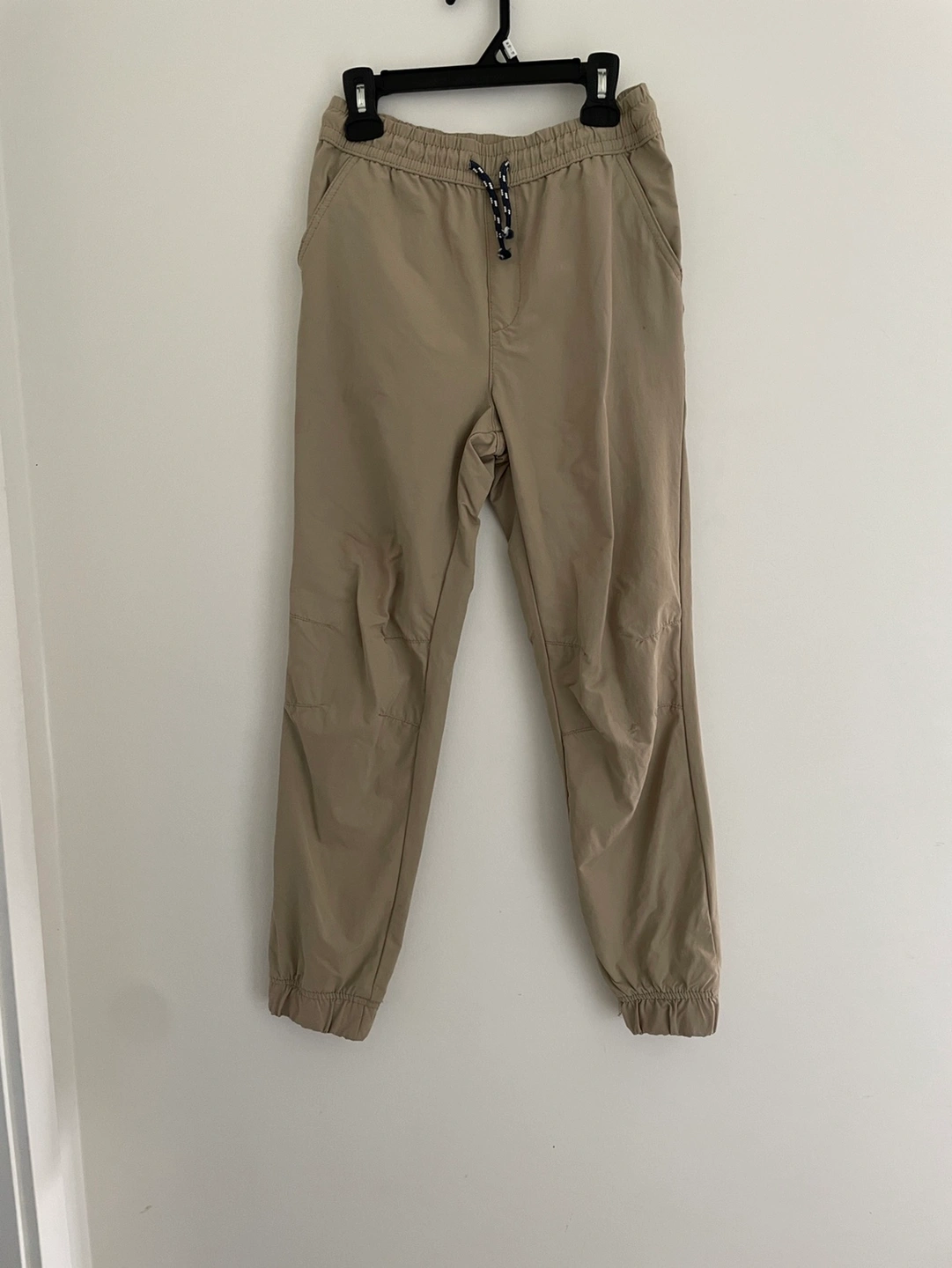 Four pieces of boys' clothing, including a button-down plaid shirt, a pair of light-wash denim jeans, and a pair of khaki joggers, and a black Jordan t-shirt.