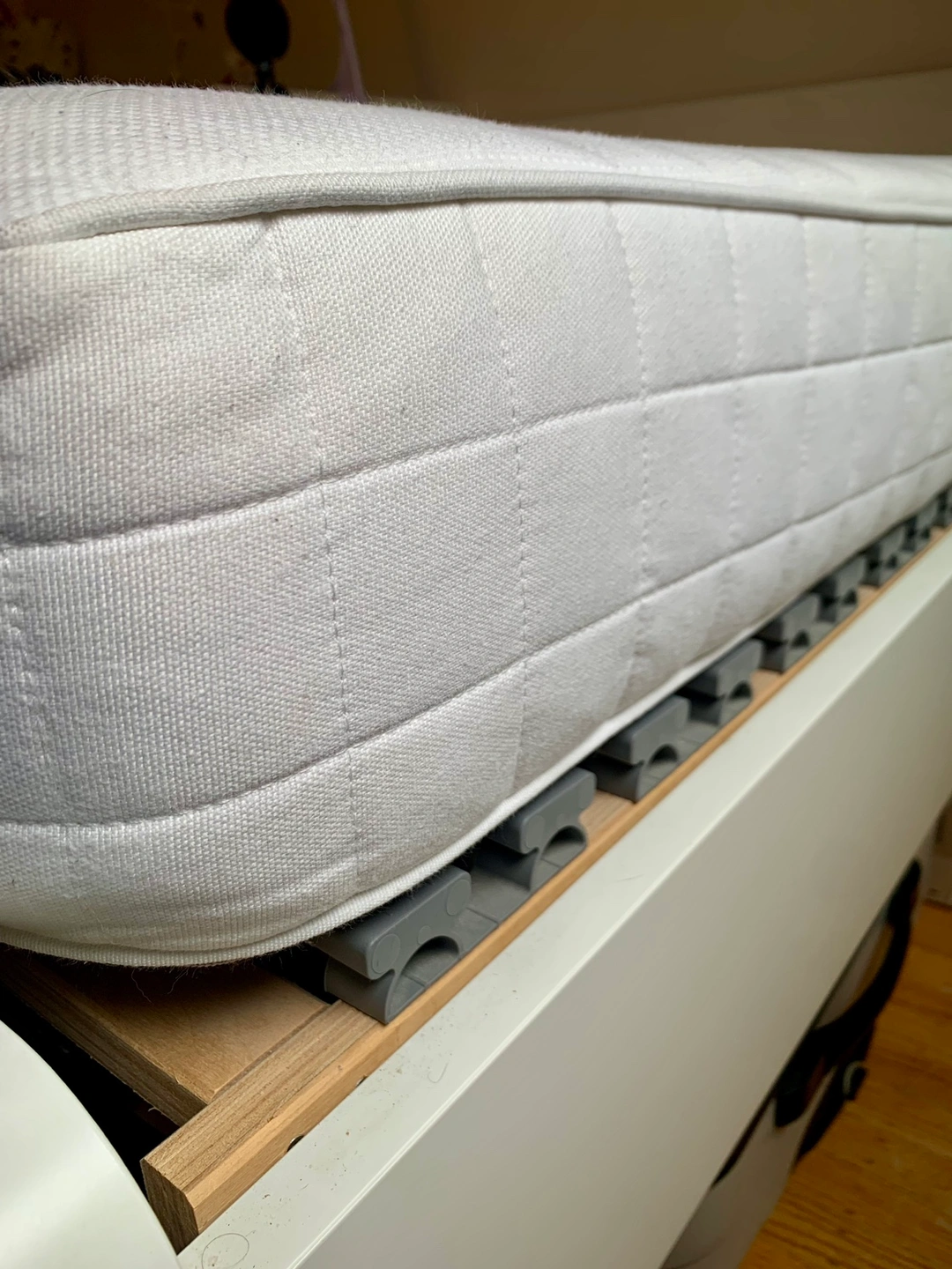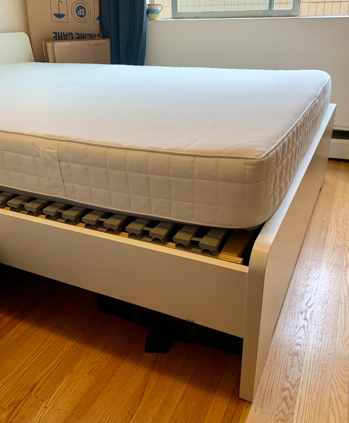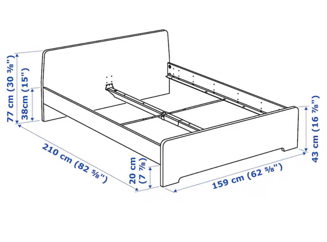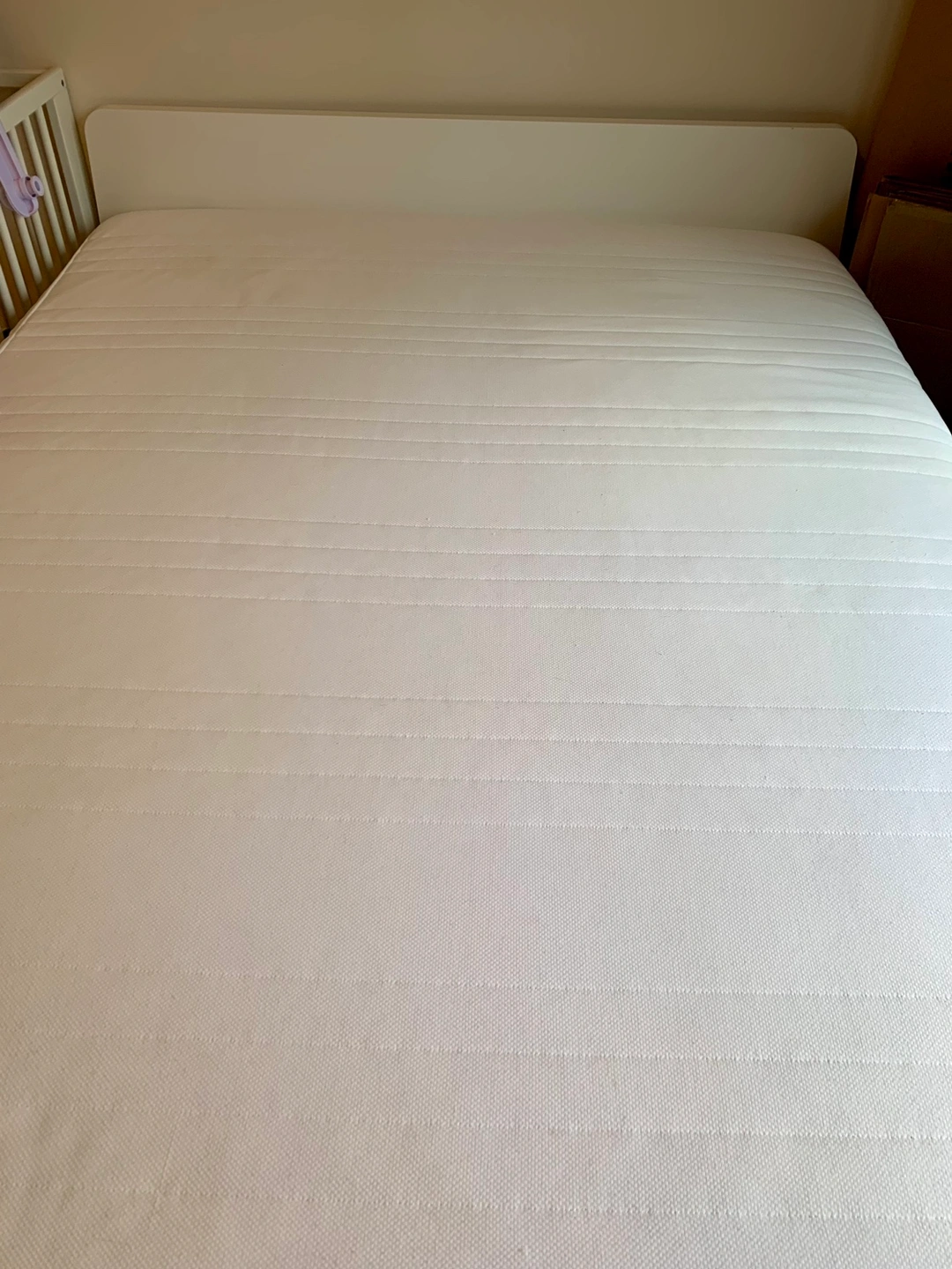 White bed frame Askvoll from Ikea in excellent condition. Comes with the Lönset slatted base. Its curved slats absorbs body weight, while comfort zones offer softer areas around your hips and shoulders to help keep your spine aligned for improved comfort and support. So amazing and unforgettable discontinued in Canada! Package also includes Matrand mattress, also from Ikea in excellent condition (always used with mattress protector & we just washed the mattress cover). We absolutely love this mattress, it’s the best we ever had! The memory foam does its magic while you sleep. It molds to your body giving you snug comfort and support, so you feel like new every time you wake up. Sadly also discontinued in Canada. Everything will be dissembled for your convenience. Pick up in the West End on Barclay Street (Thurlow). Available now. Any questions, please ask ☺️ Cash or etransfer